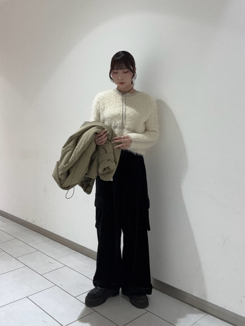 カーゴパンツとダウンのアウターでカジュアルさがありつつも、ニットやベロア素材のアイテムと合わせるとこで綺麗めな印象も与えてくれるコーデです🥲✨
