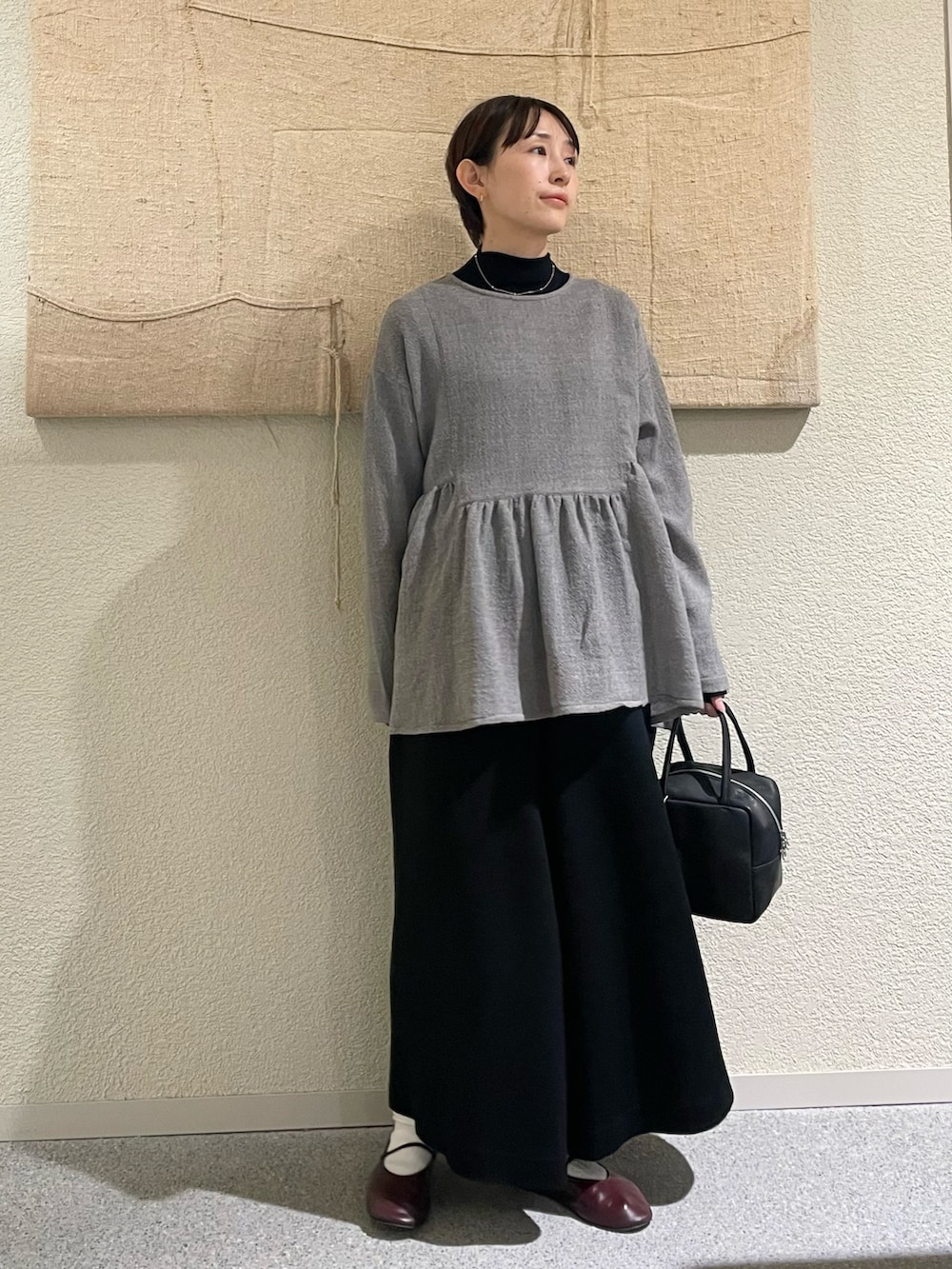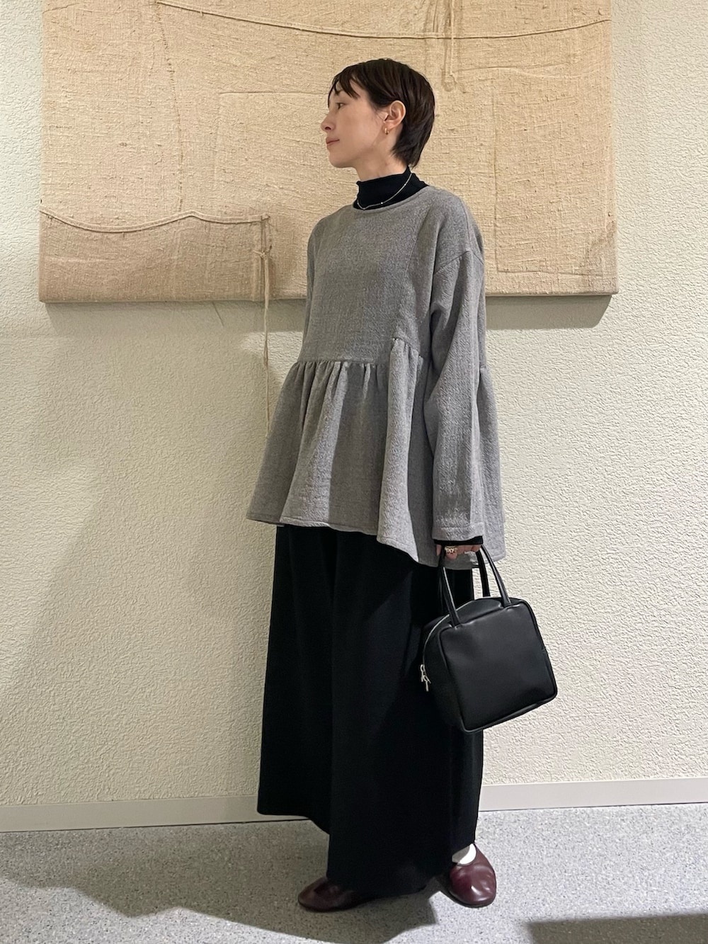 ボトムもボリュームのある、ウールカットワイドキュロットを合わせて新鮮なバランス・シルエットにしてみました。