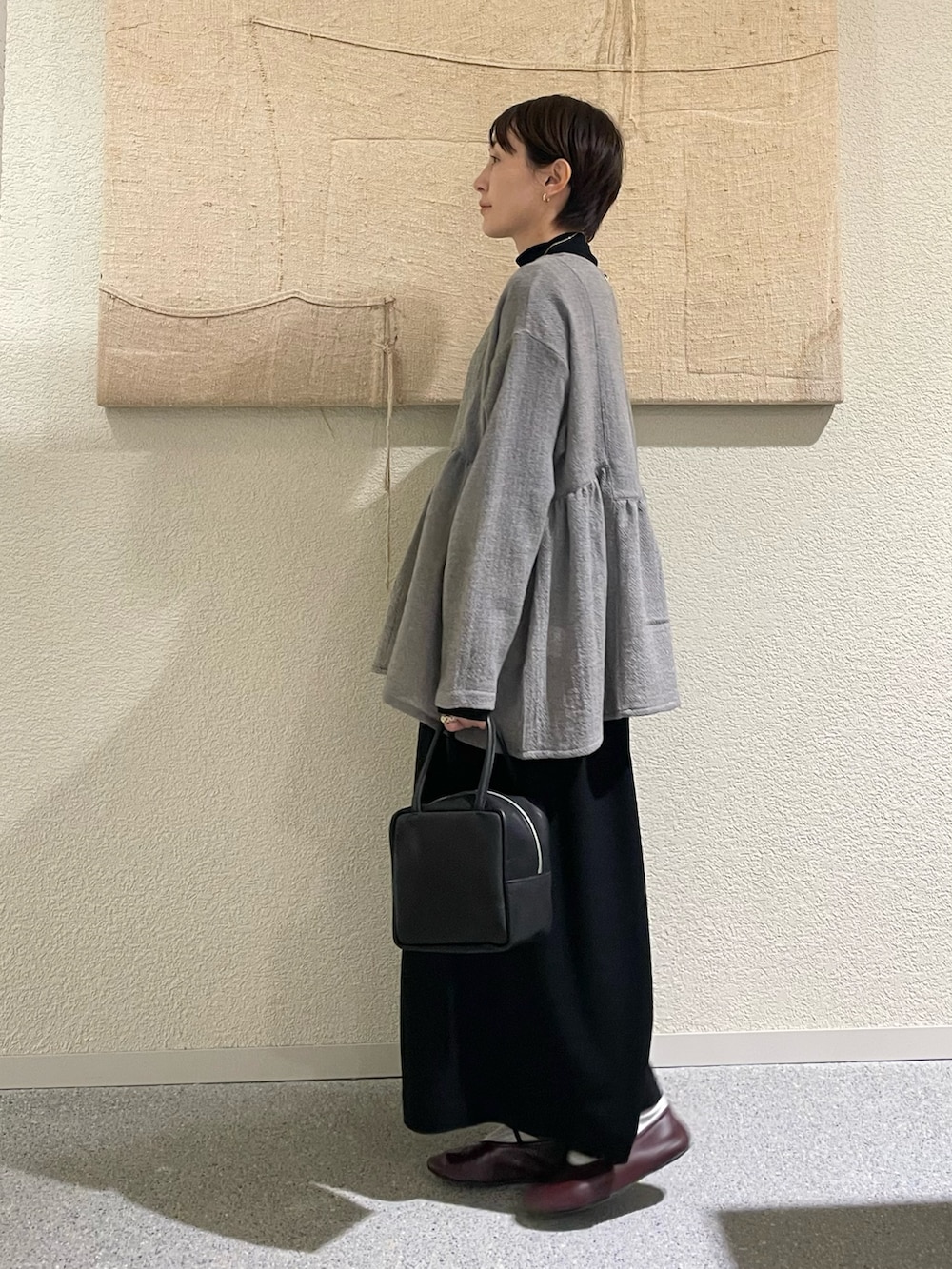 あえてボリュームのあるアイテム同士でゆるっとしたバランスで合わせた綺麗目スタイルです。