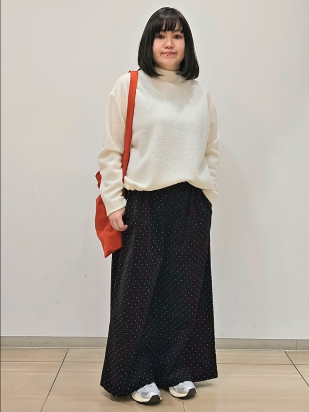 黒地に白いドット柄が可愛いパンツです。ワイドシルエットなので体型を気にせず、ゆったりと楽に着ていただけます!