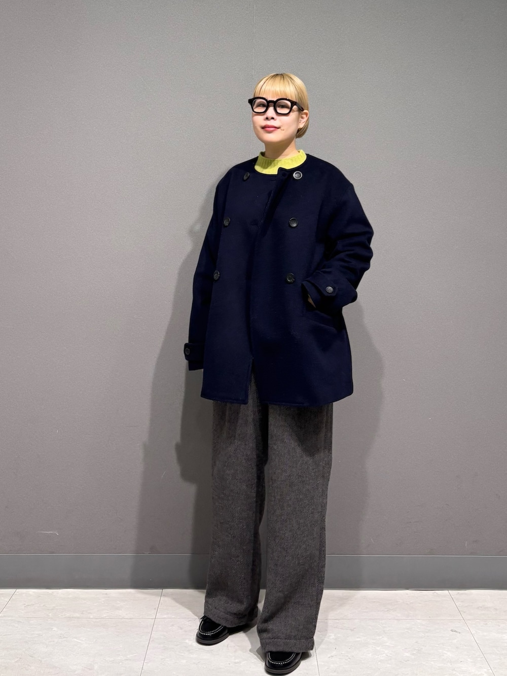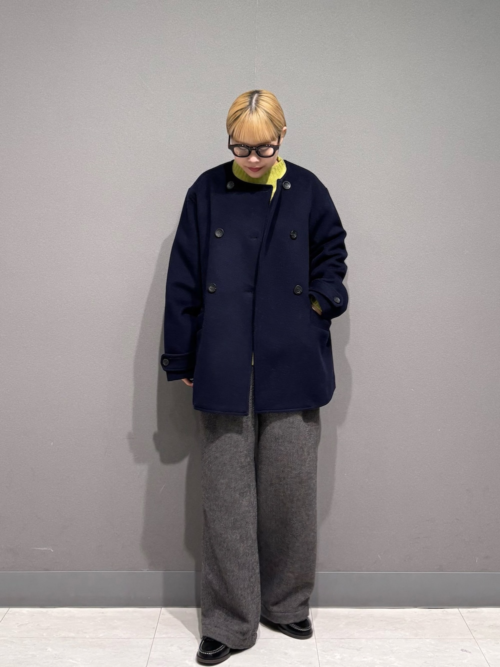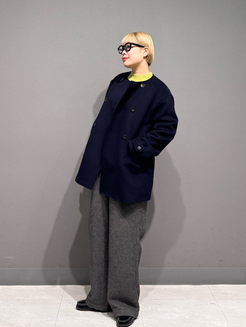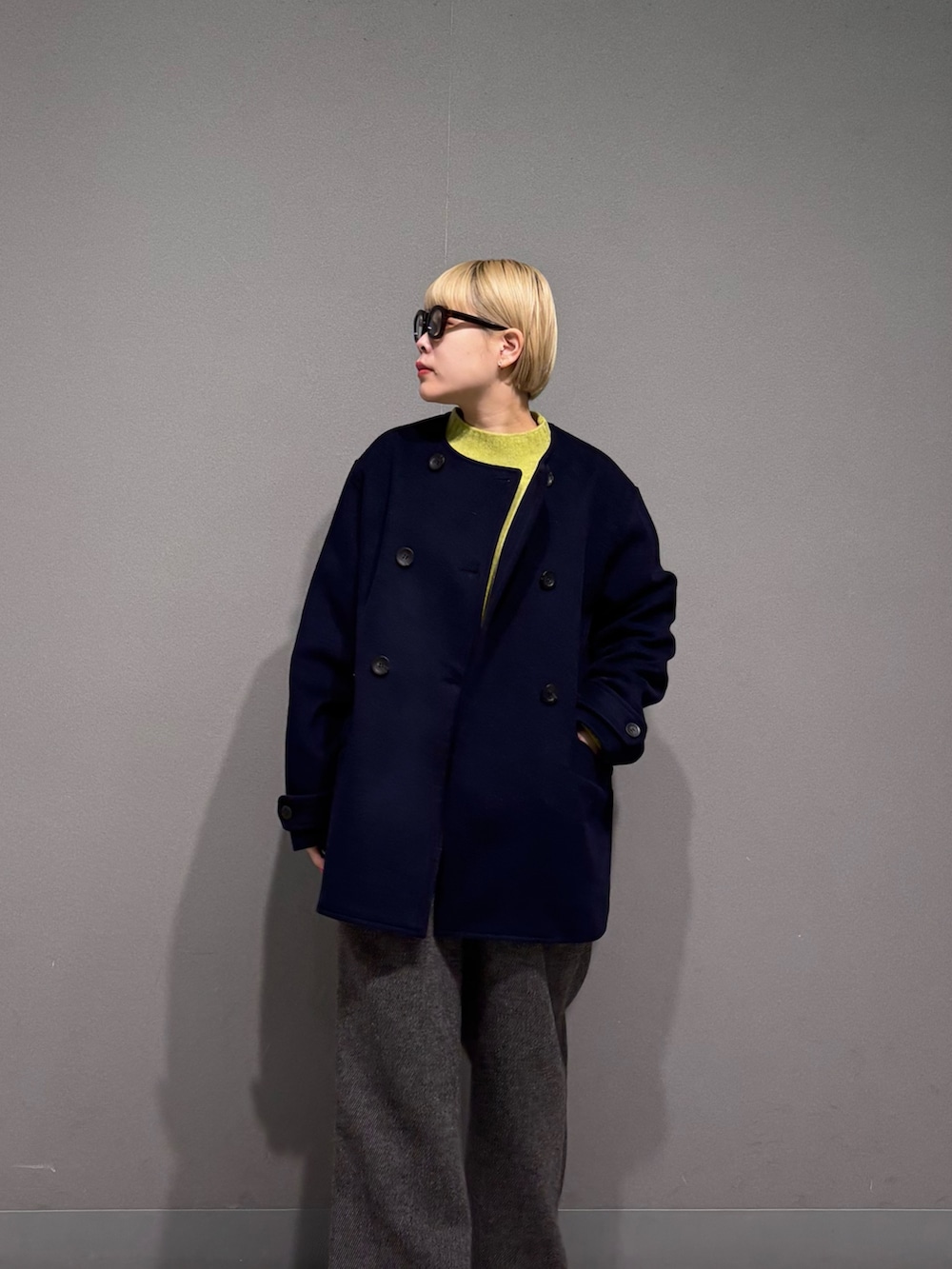 ニットが首元からチラッと見えても可愛いので、ノーカラーのアウターにしました。