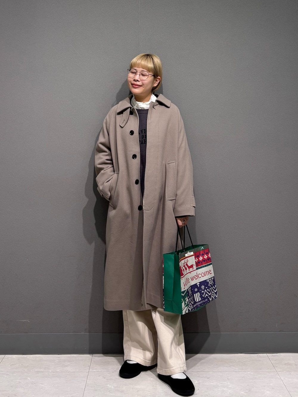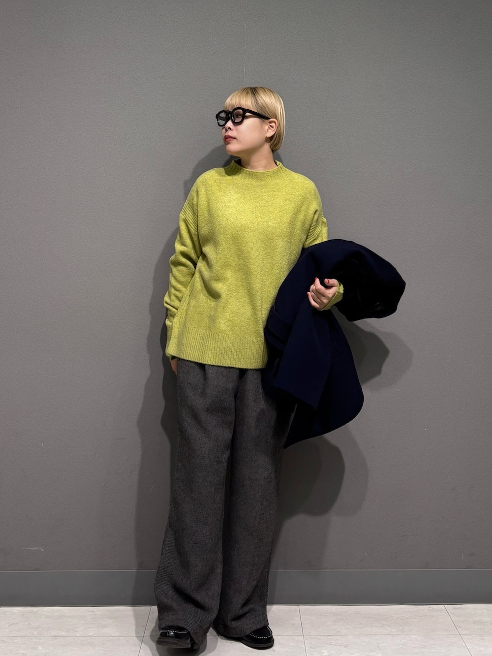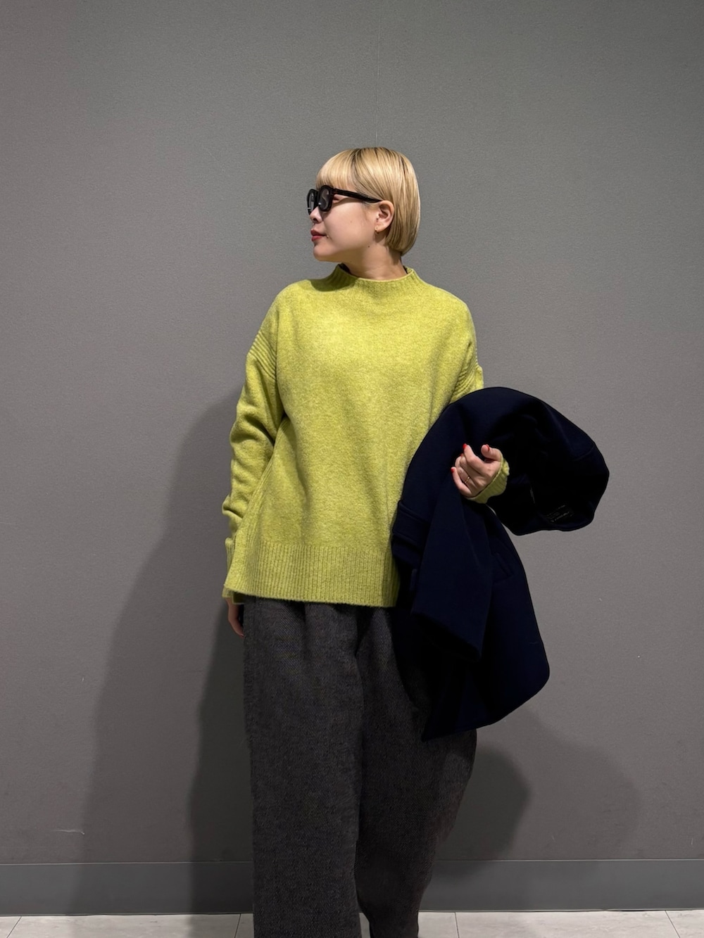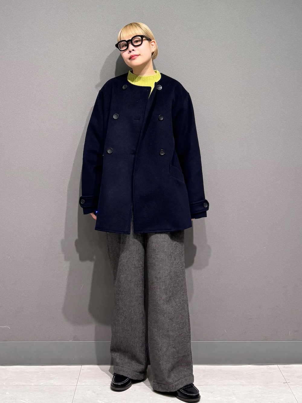 ニットが首元からチラッと見えても可愛いので、ノーカラーのアウターにしました。
