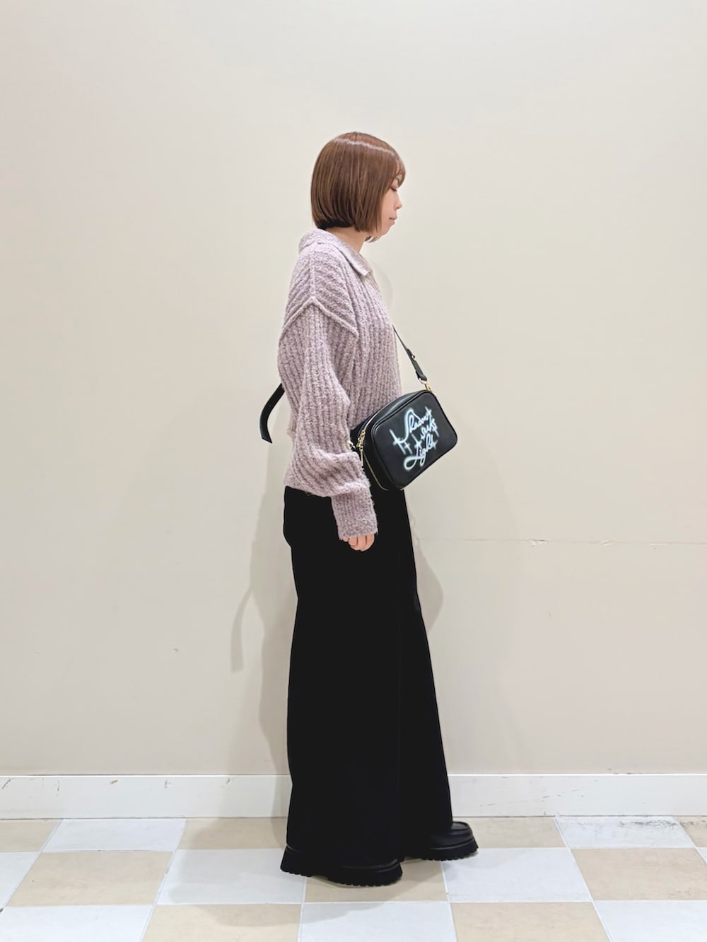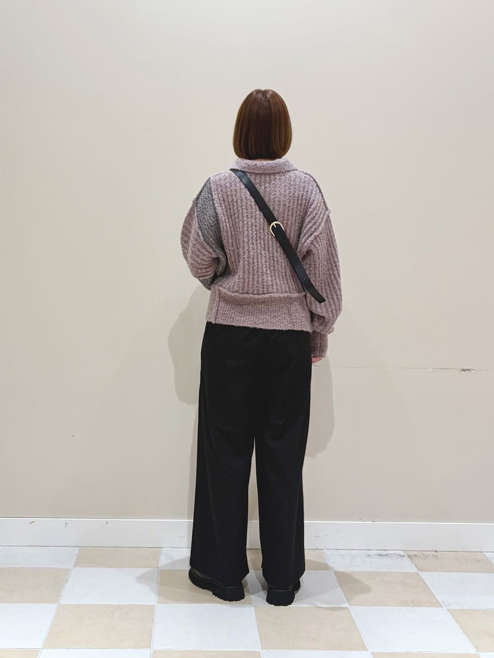 ブークレ素材でバイカラーのデザインが可愛いポロニットにドット柄のイージーストレートパンツでカジュアルなスタイルにしました!