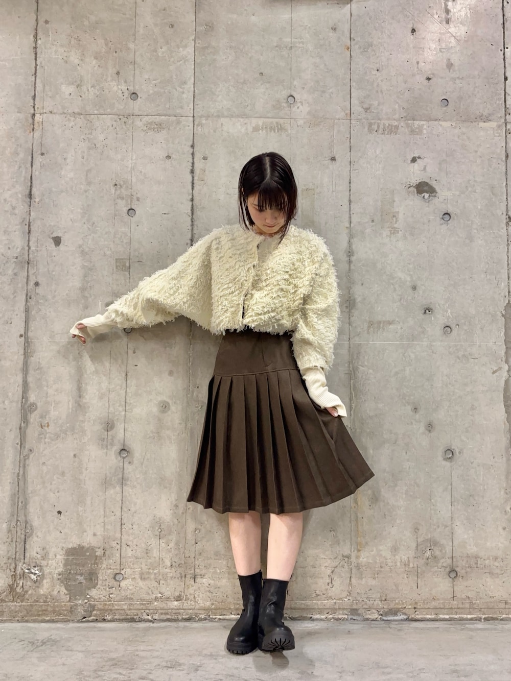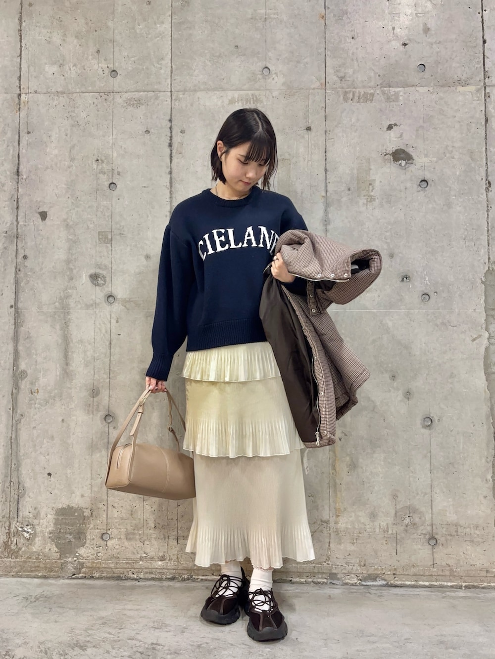 白のティアードスカートにネイビーのロゴニットでカジュアルさとガーリーさを合わせて、お出かけにもぴったりです💭