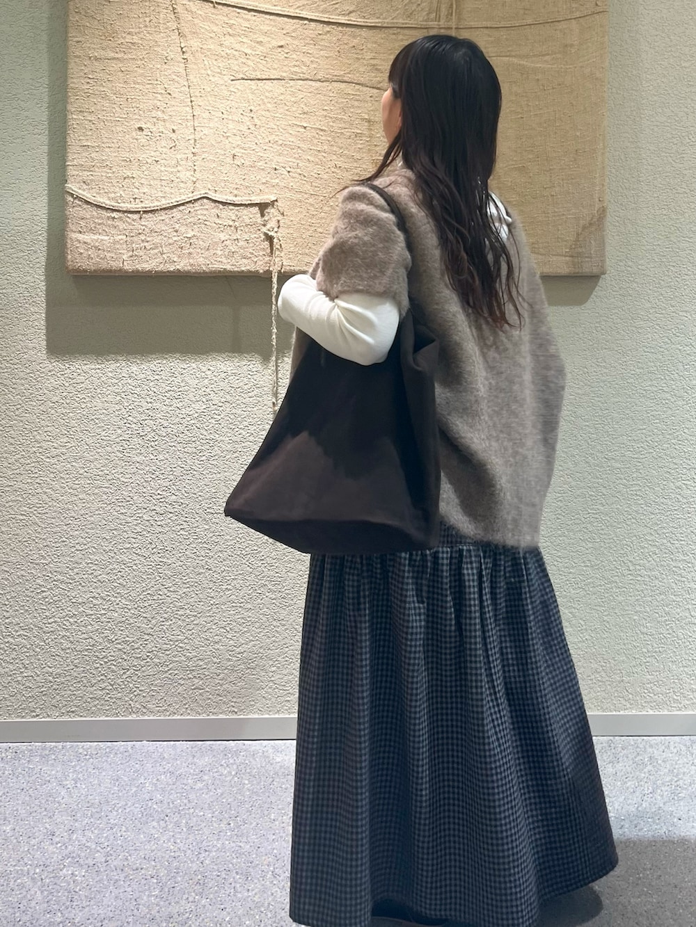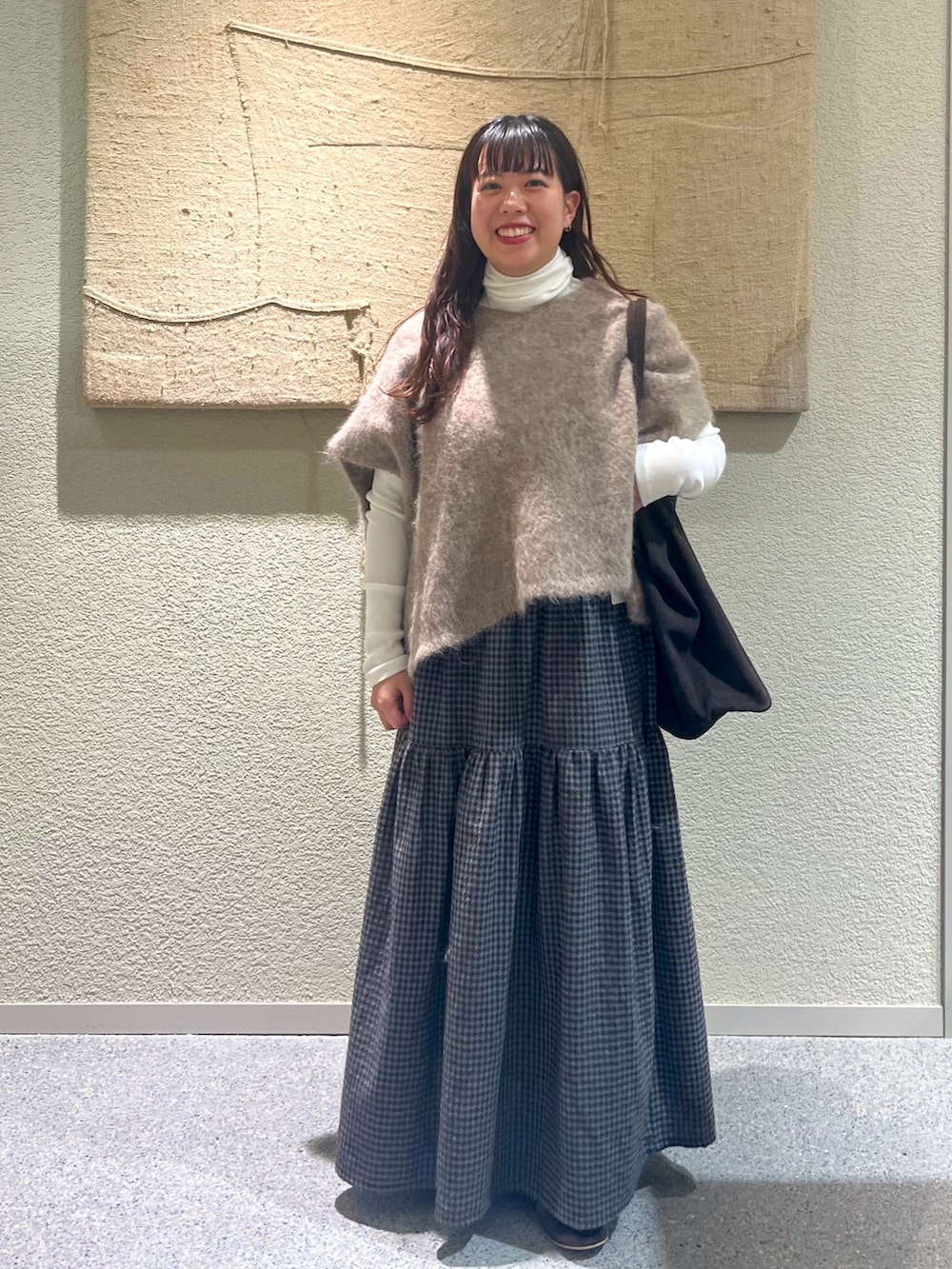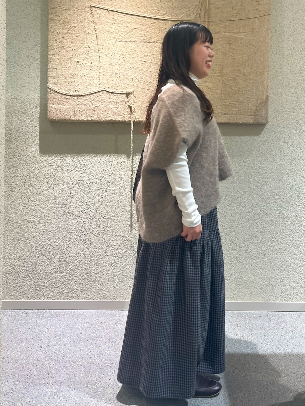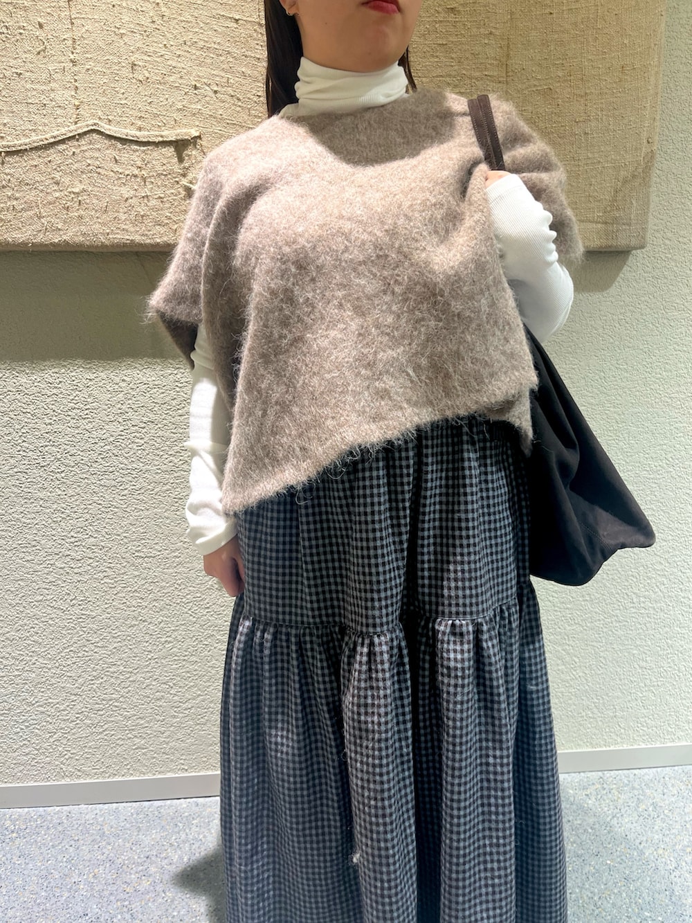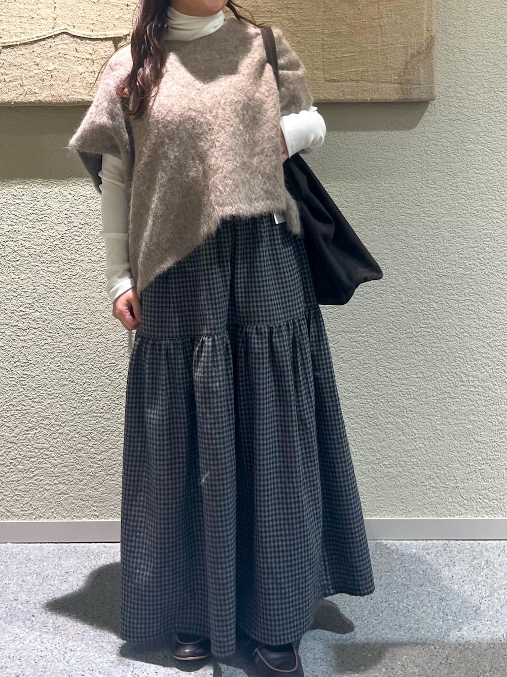 アルパカのニットベストとギンガムチェックスカートが甘すぎず、大人かわいいコーデです◎