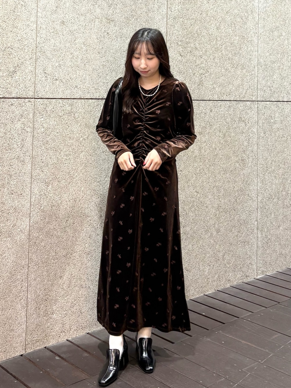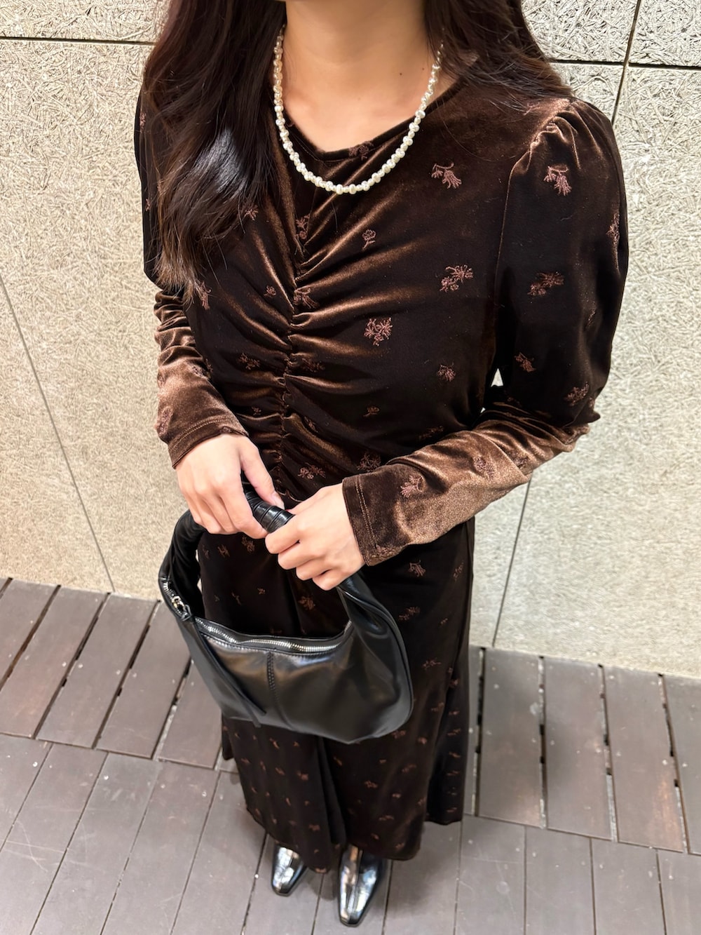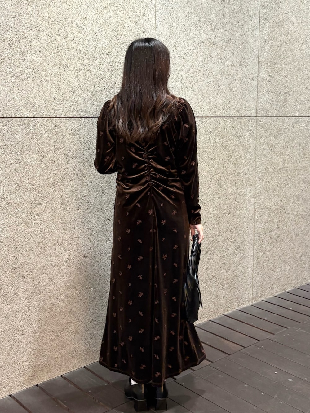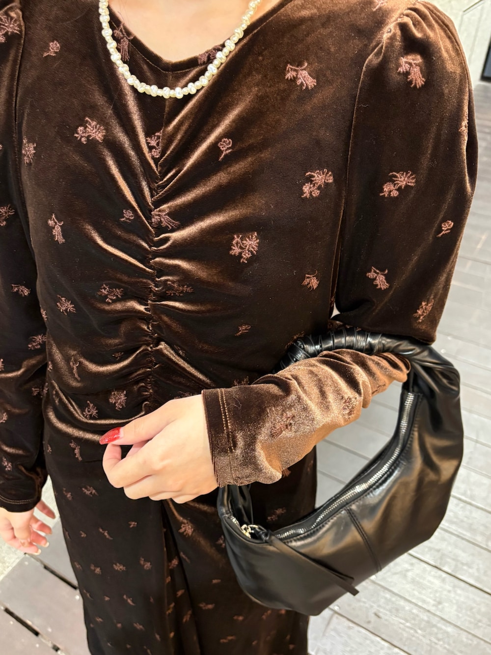 胸元のシャーリングが女性らしいベロアワンピース 👗🤎