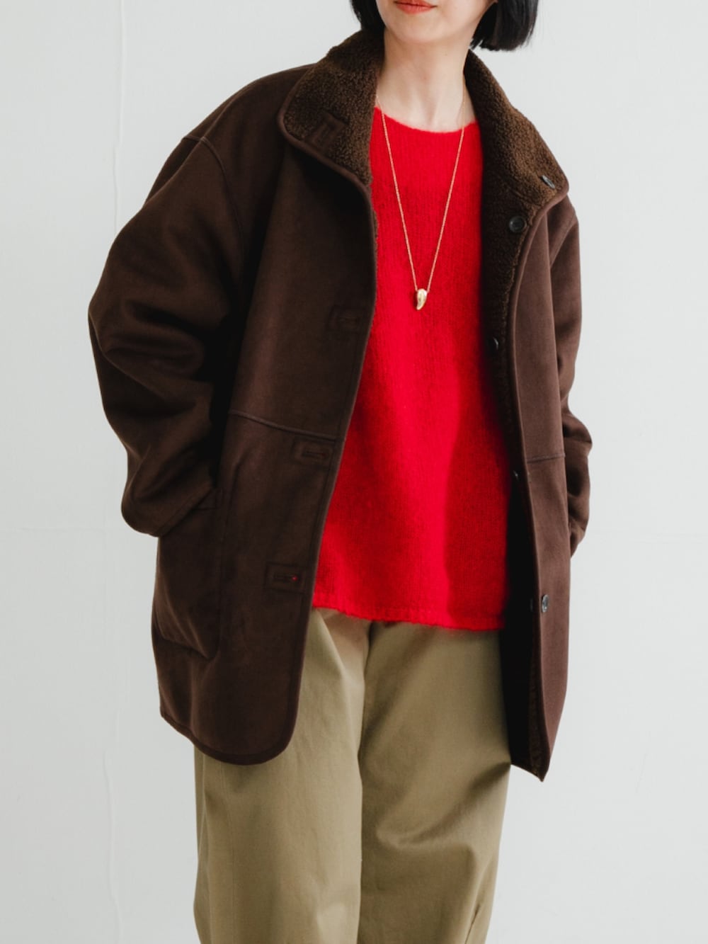 フランスのエコファーブランド「ECOPEL(エコペル)」に別注した、リバーシブルムートンコート。繊細な起毛感のフェイクスエード生地と、柔らかな風合いのボアを使用したフェイクムートン素材です。