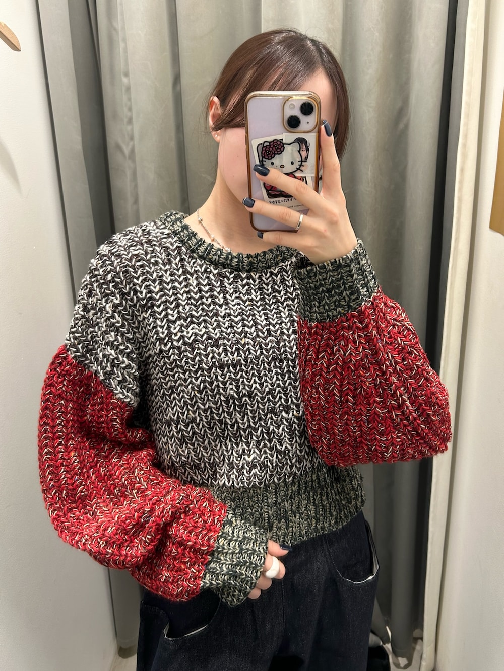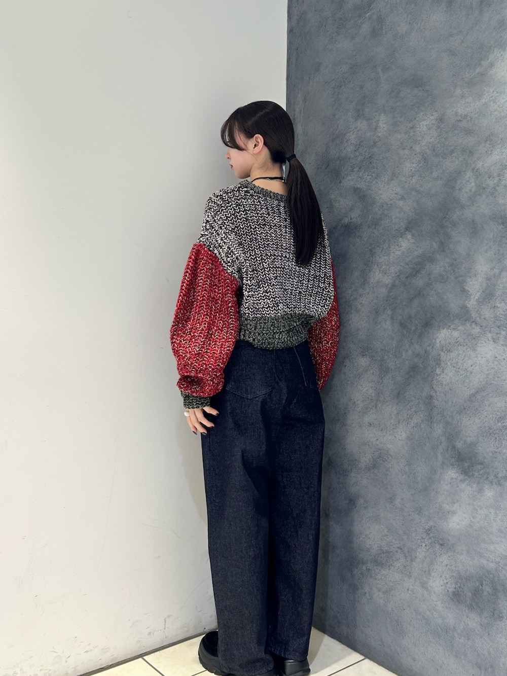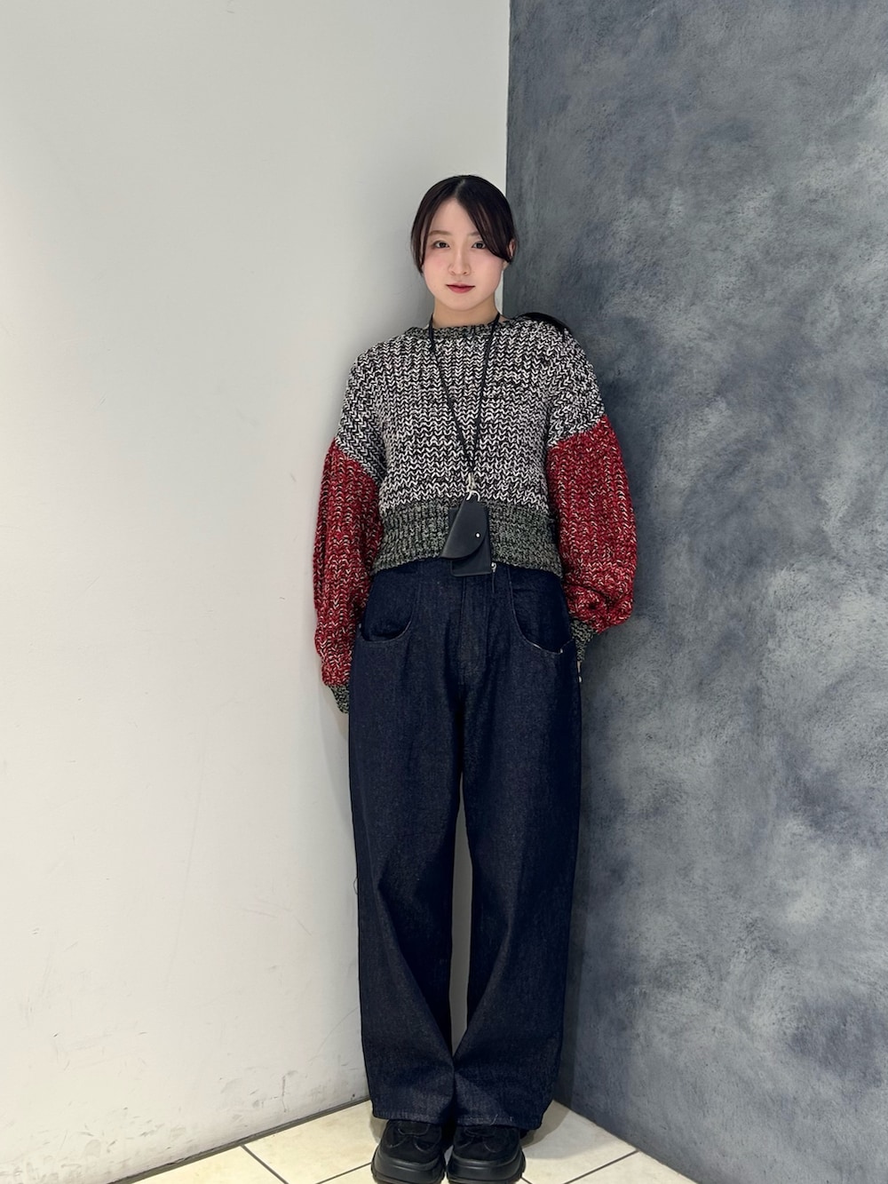 赤袖がアクセントになったミックスニットを主役に、デニムでラフにまとめたスタイル🌟