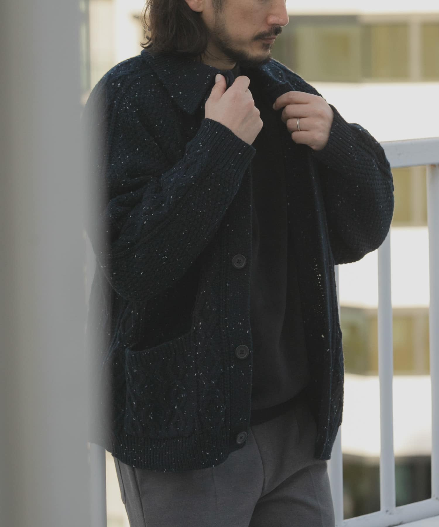 今回はウール混のフィッシャーマンカーディガンを主役に。