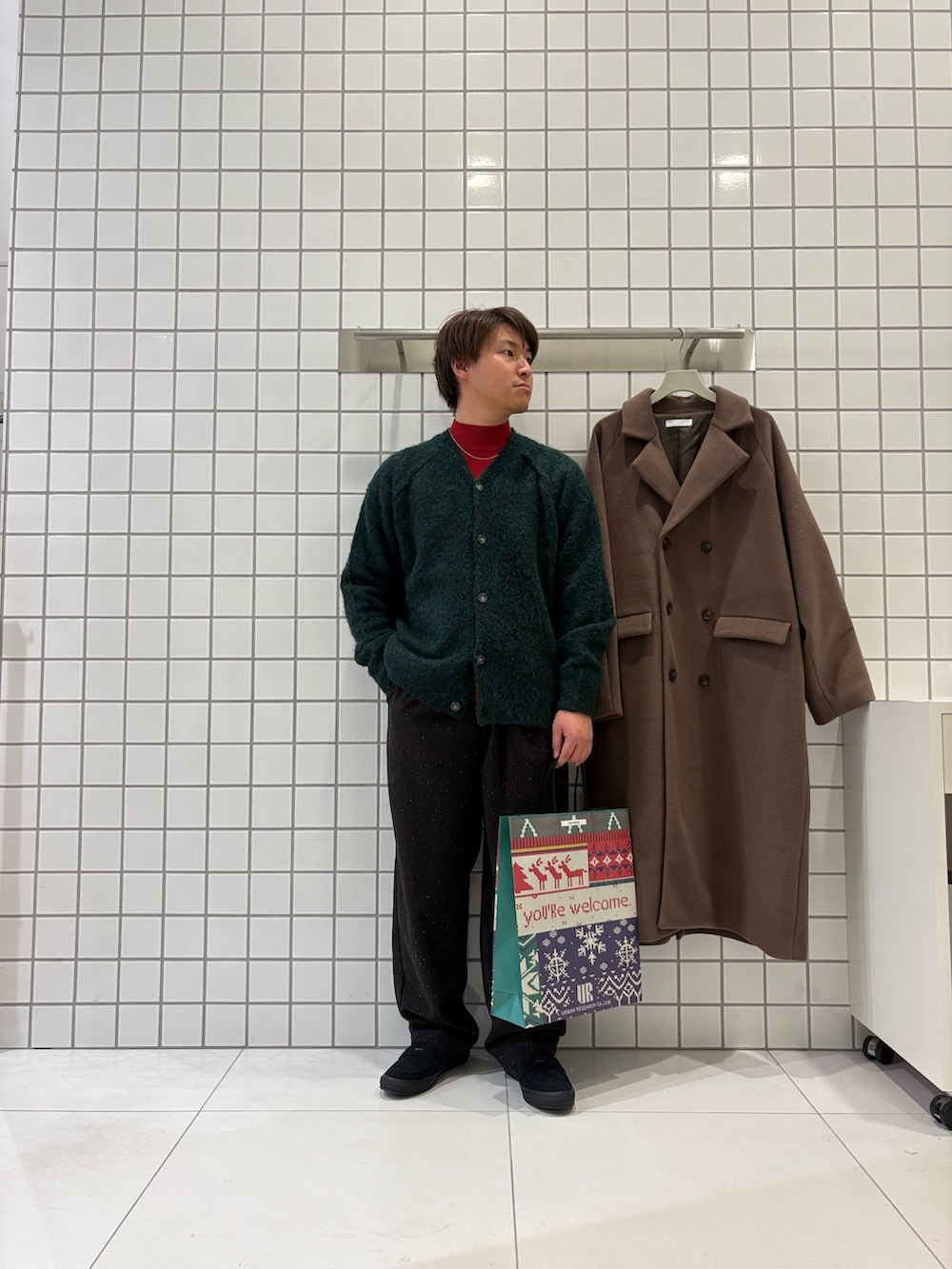 赤のハイネックニットと、グリーンのカーディガンでホリデー感満載な色合わせ!🎄