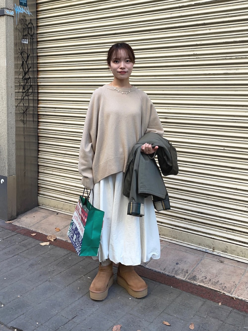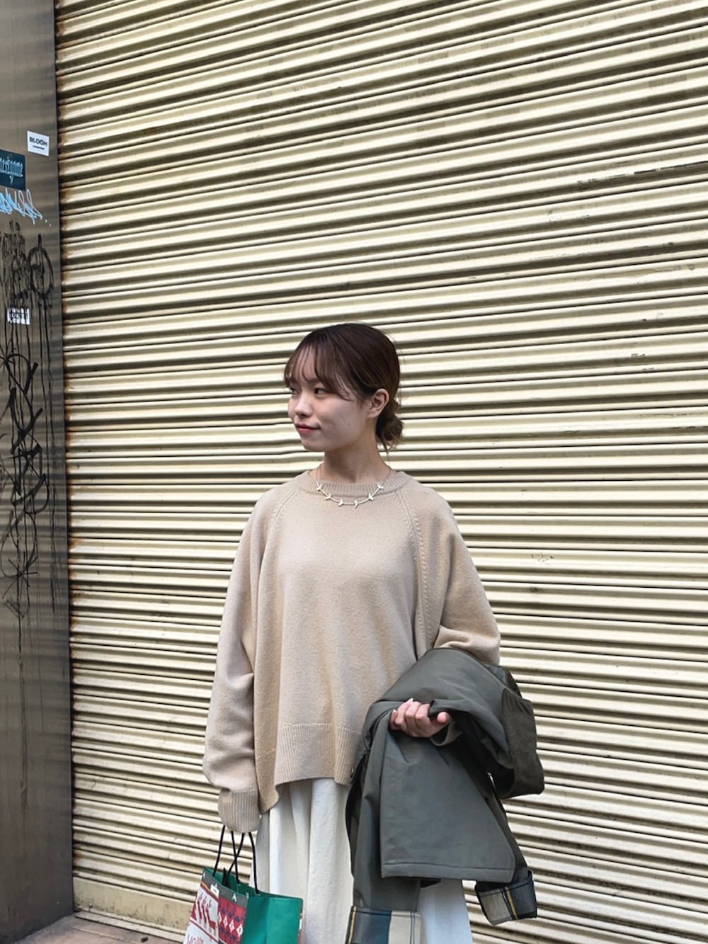 中のニットはカシミヤが入ったなめらかで、柔らかいアイテムで、上品なニットに仕上がります!程よく詰まったクルーネックとお尻周りが少し隠れる程よい着丈がオススメです!ゆるっと着れるので、中にタートルやシャツと合わせてきても可愛いと思います✨