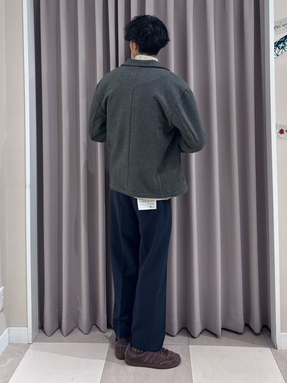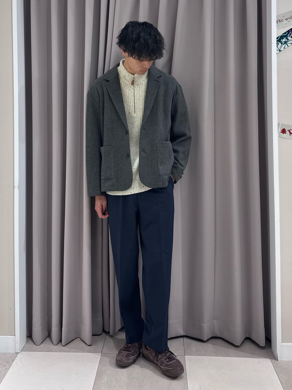 インナーにハーフジップデザインのニットでカジュアルダウン。程よい緩さのあるスタイリング。