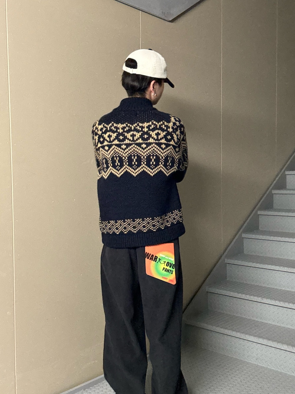 トップスに柄を持ってくる分、パンツとシューズは黒でまとめてバランスを取っている。