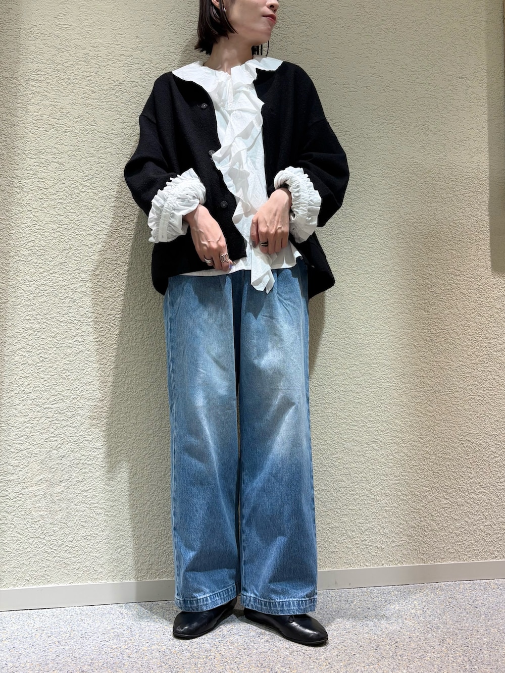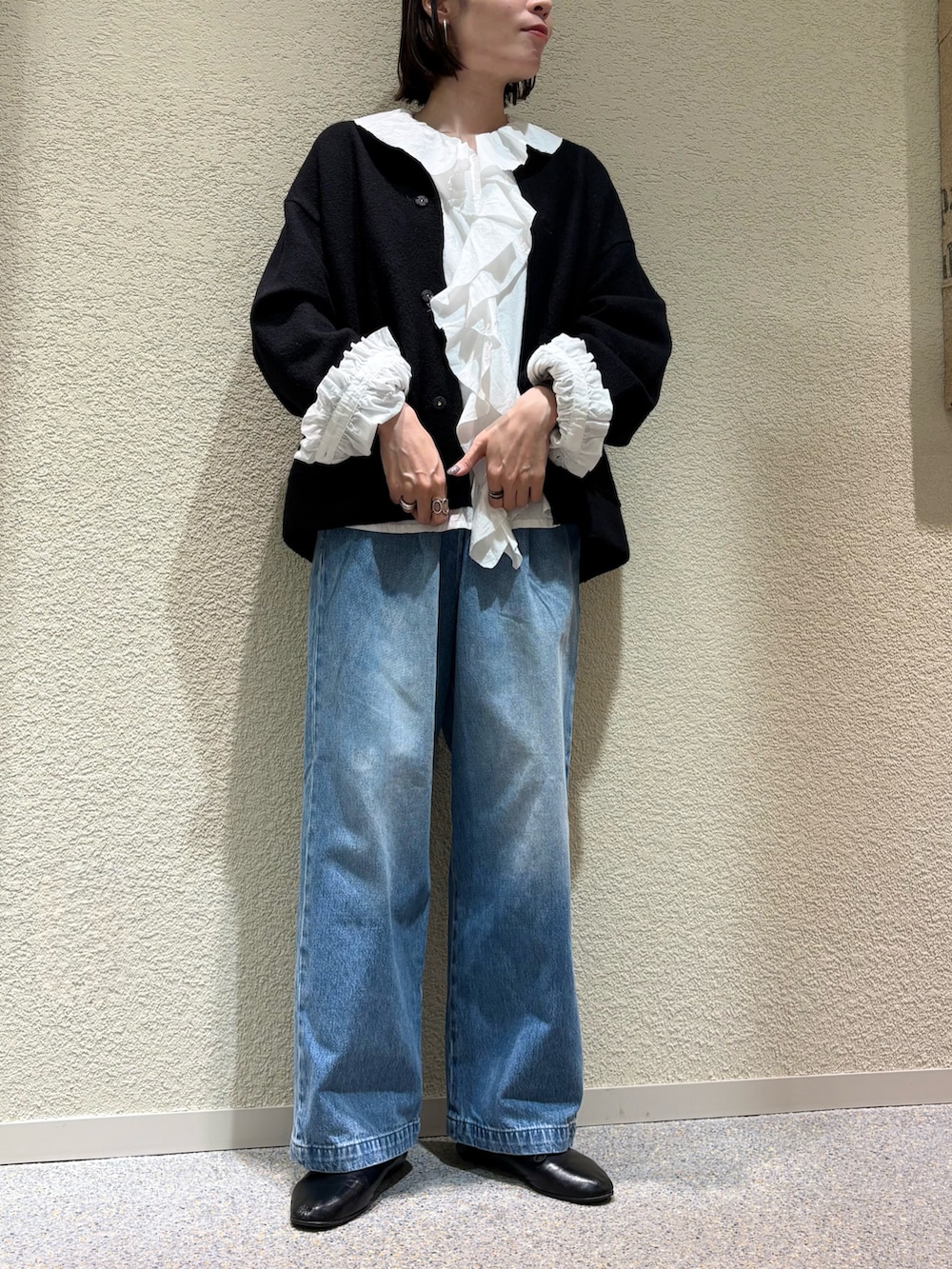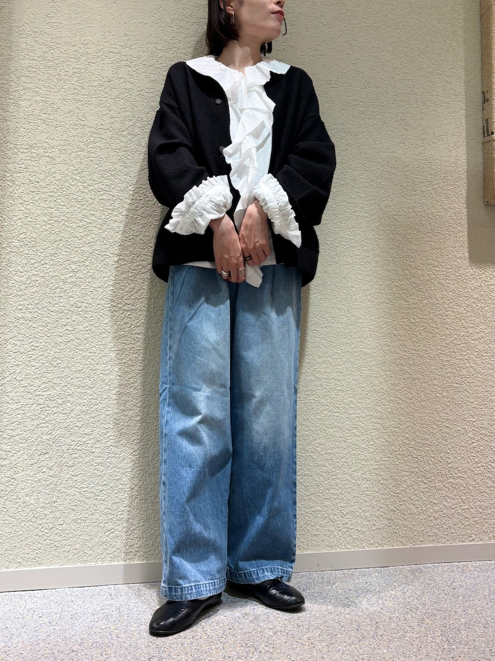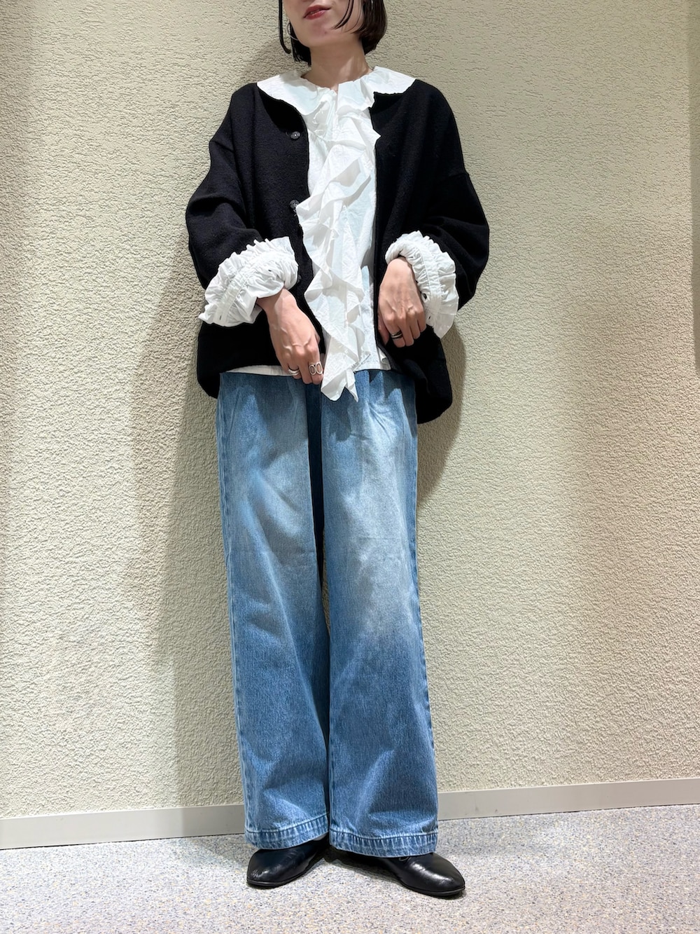 フリルのデザインがとても素敵なデザインのシャツで、これを着るだけで一気にコーディネートが華やかになります。