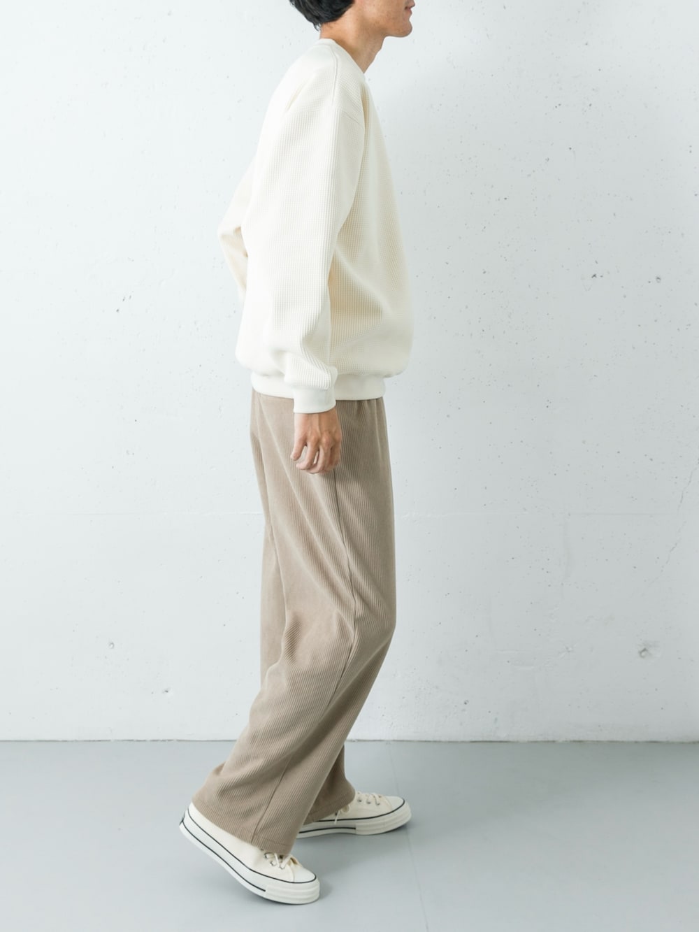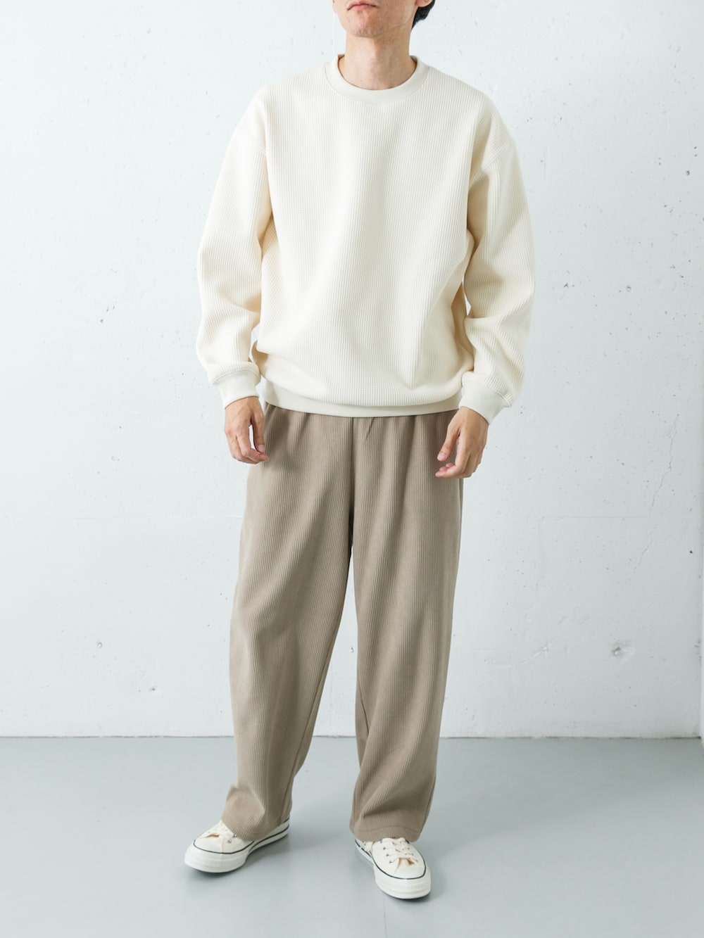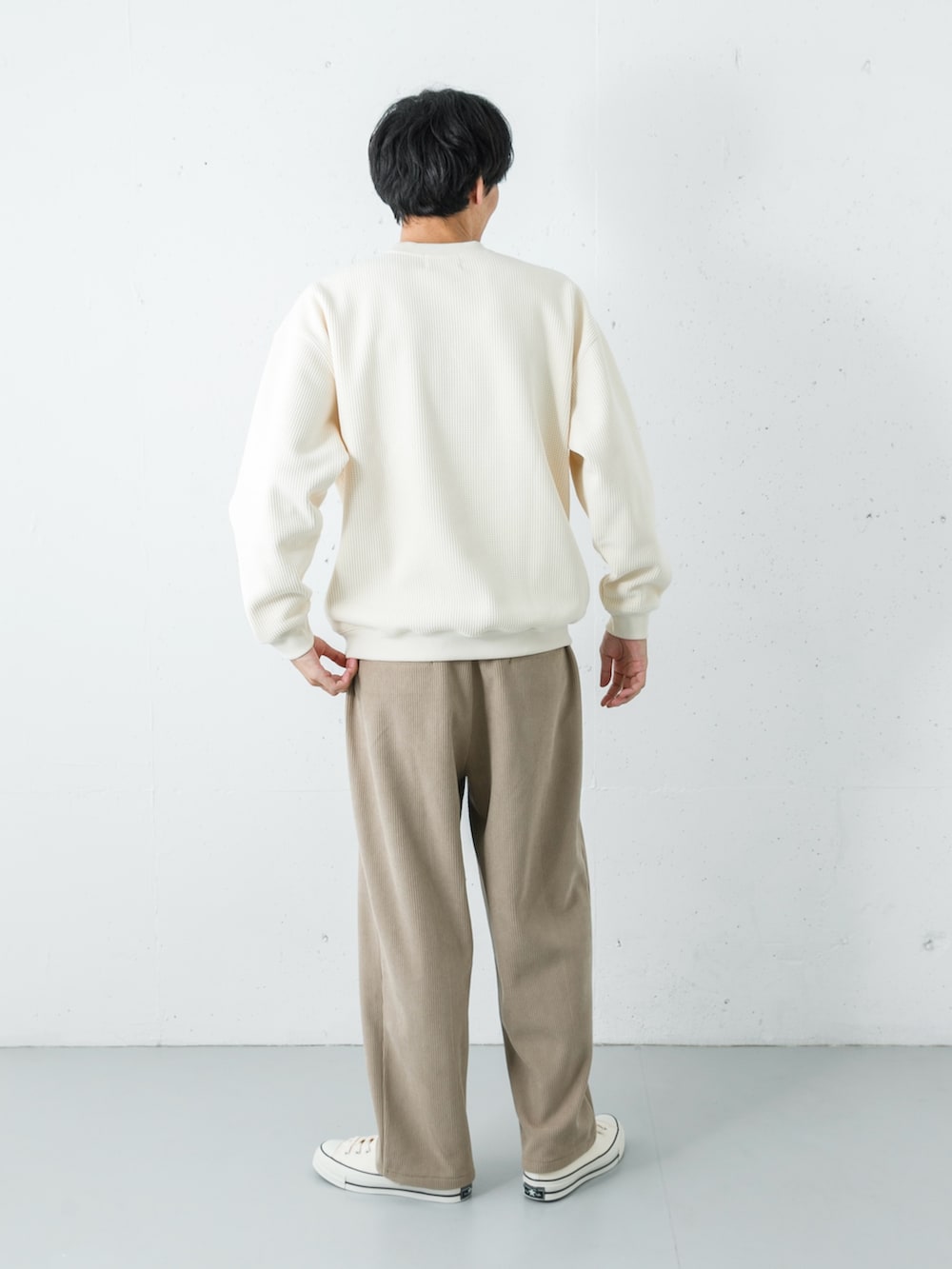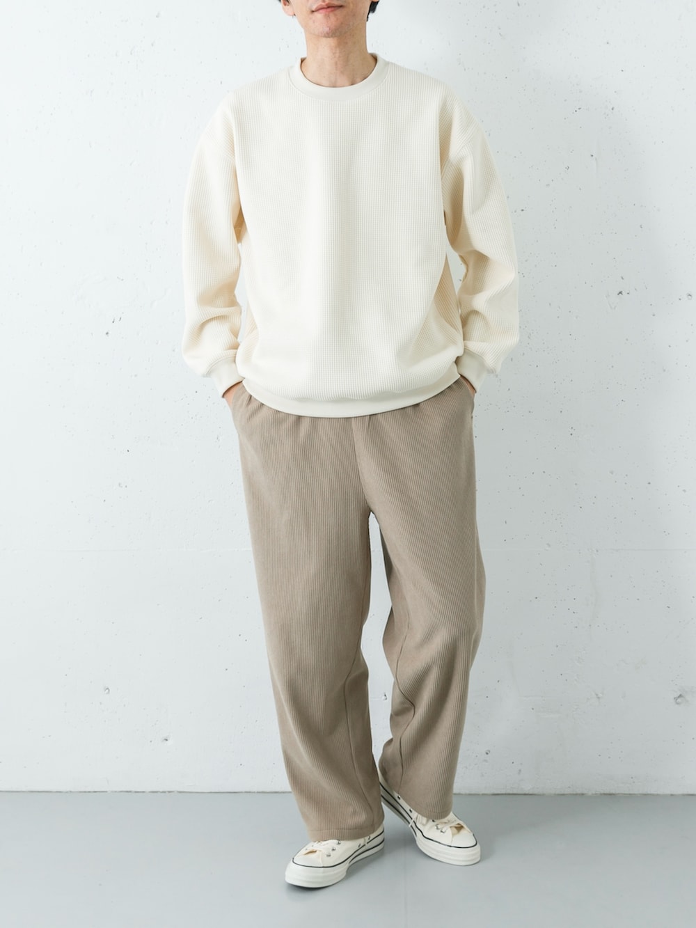 ボトムスには、冬の定番素材をさらに暖かくアップデートした裏フリースコーデュロイワイドパンツをセレクト。オフホワイトのトップスからベージュのパンツへと繋がる柔らかなグラデーションが、優しく、クリーンな印象を周囲に与えます。どちらも肌に触れる面が起毛・フリース仕様になっており、リラックスフィットのシルエットも相まって、極上の着心地を実現しています。