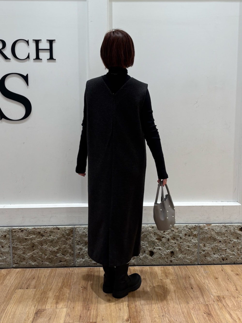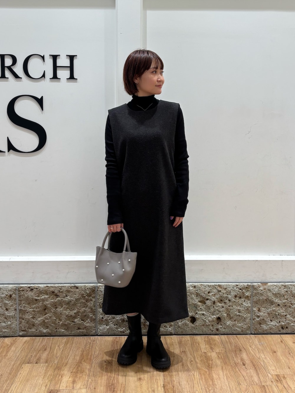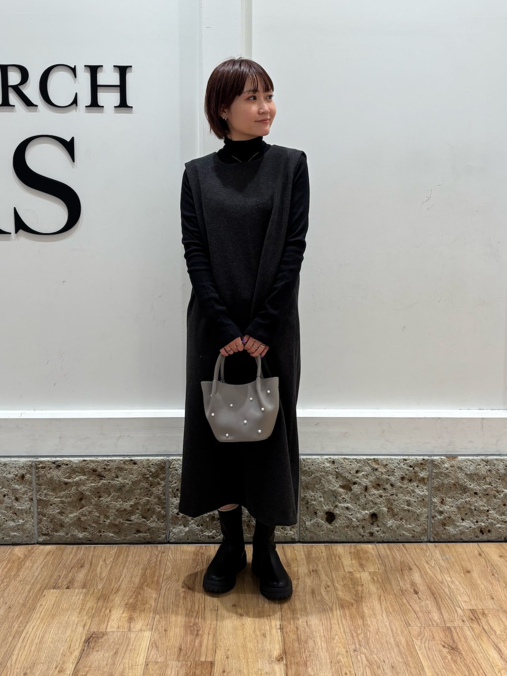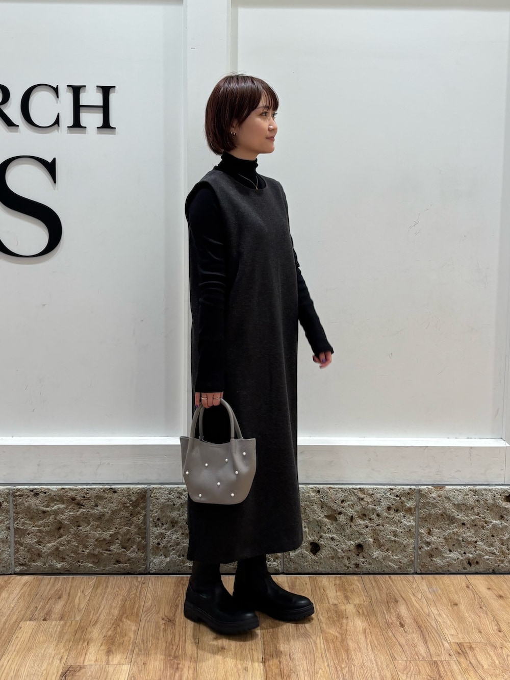 ワントーンで仕上げたのでアクセントにビーズバック持っています。クリスマスコーデにおすすめです🎄