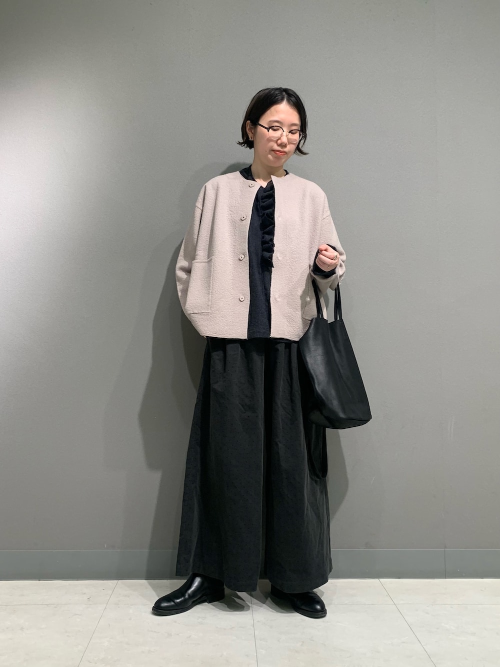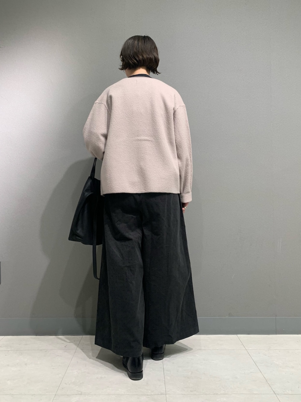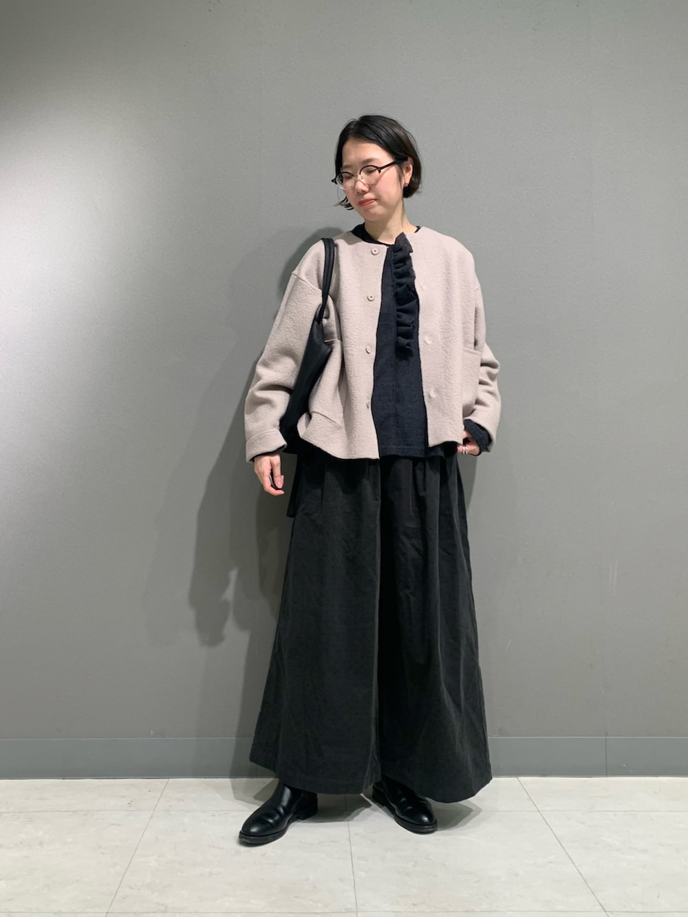 圧縮ウールの柔らかなジャケットは軽く着心地抜群です。ゆったりなシルエットが可愛く綺麗めでもカジュアルでも合わせやすいデザインになっています。袖は少し長めなので折り返して着用しています。