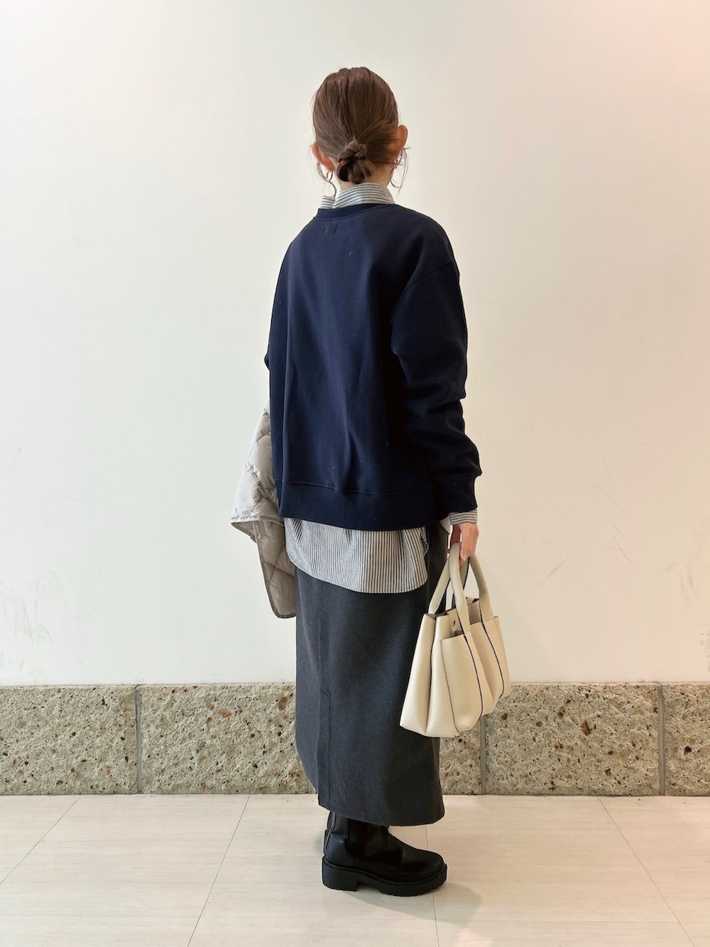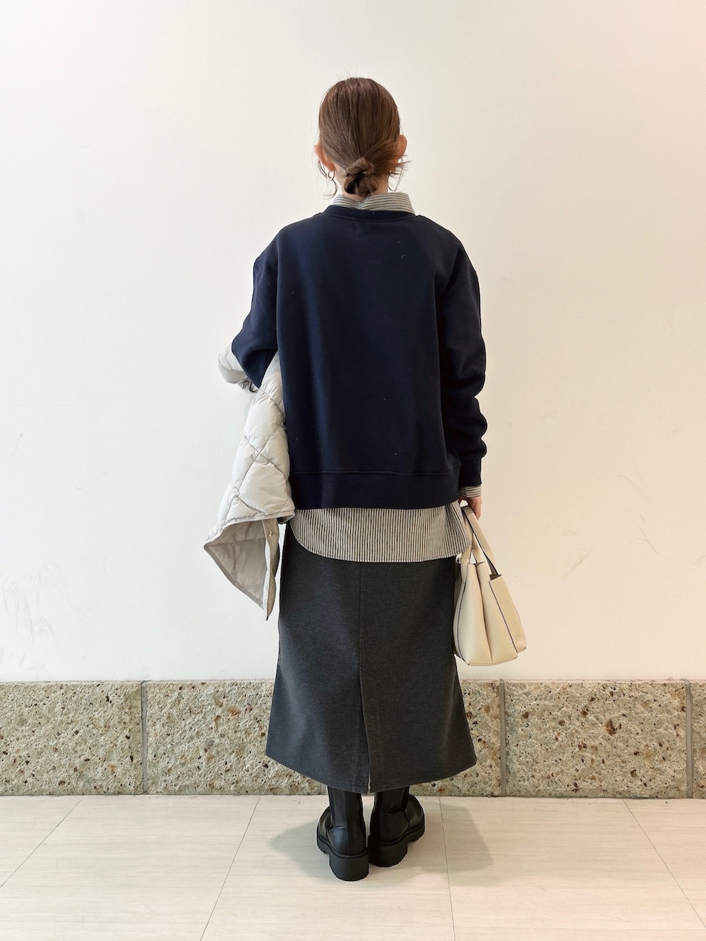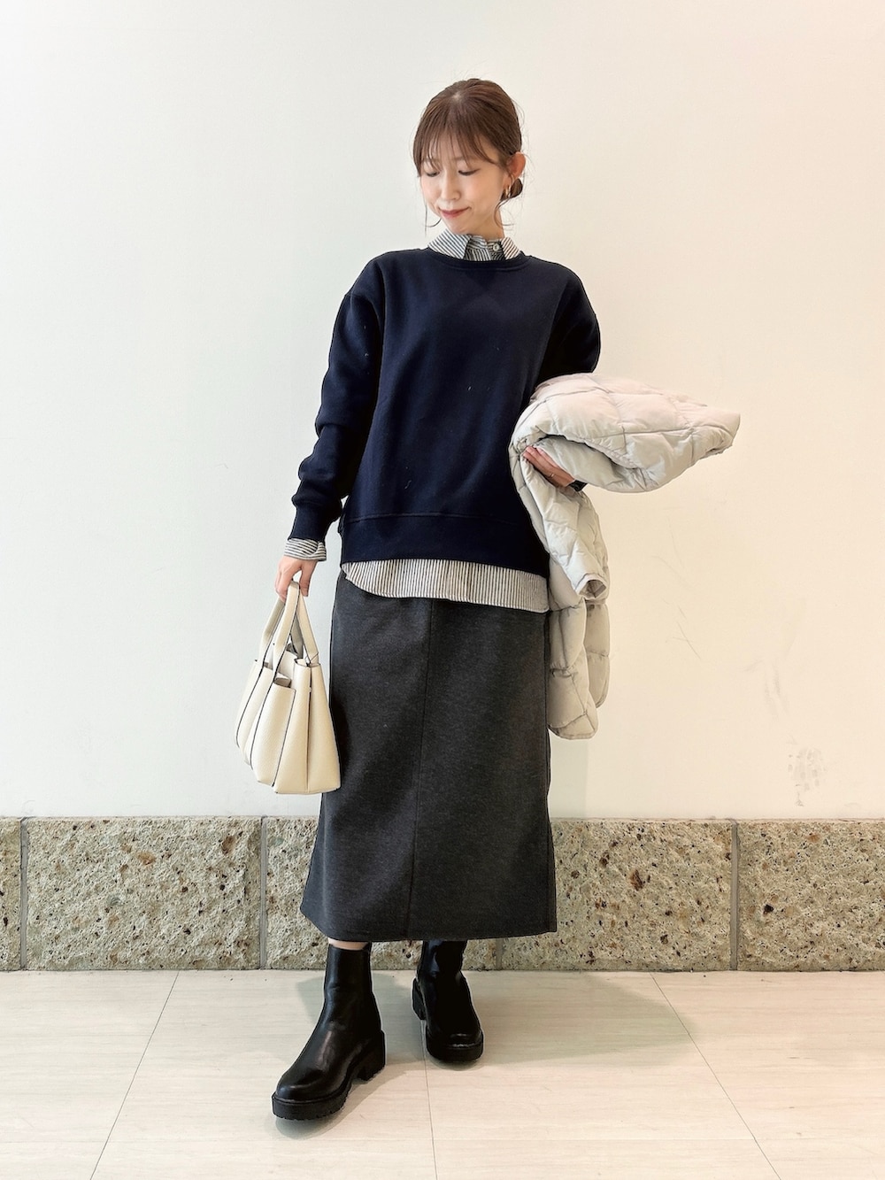 ボトムはメルトン素材のストレートスカート。