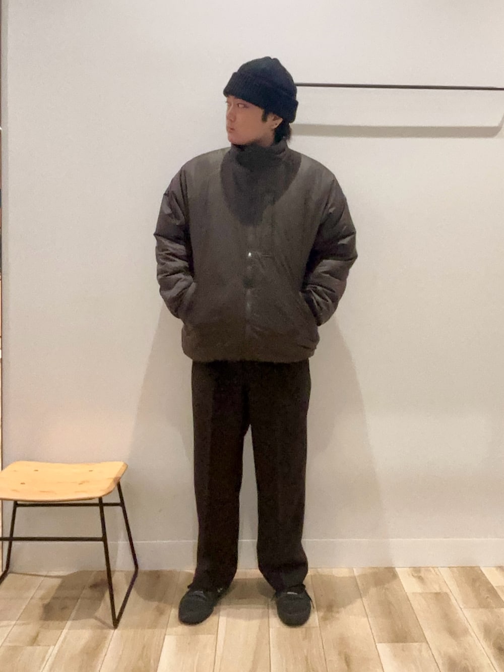 中綿ブルゾンのブラウンをメインに他のアイテムは落ち着いた色合いでまとめました✌️