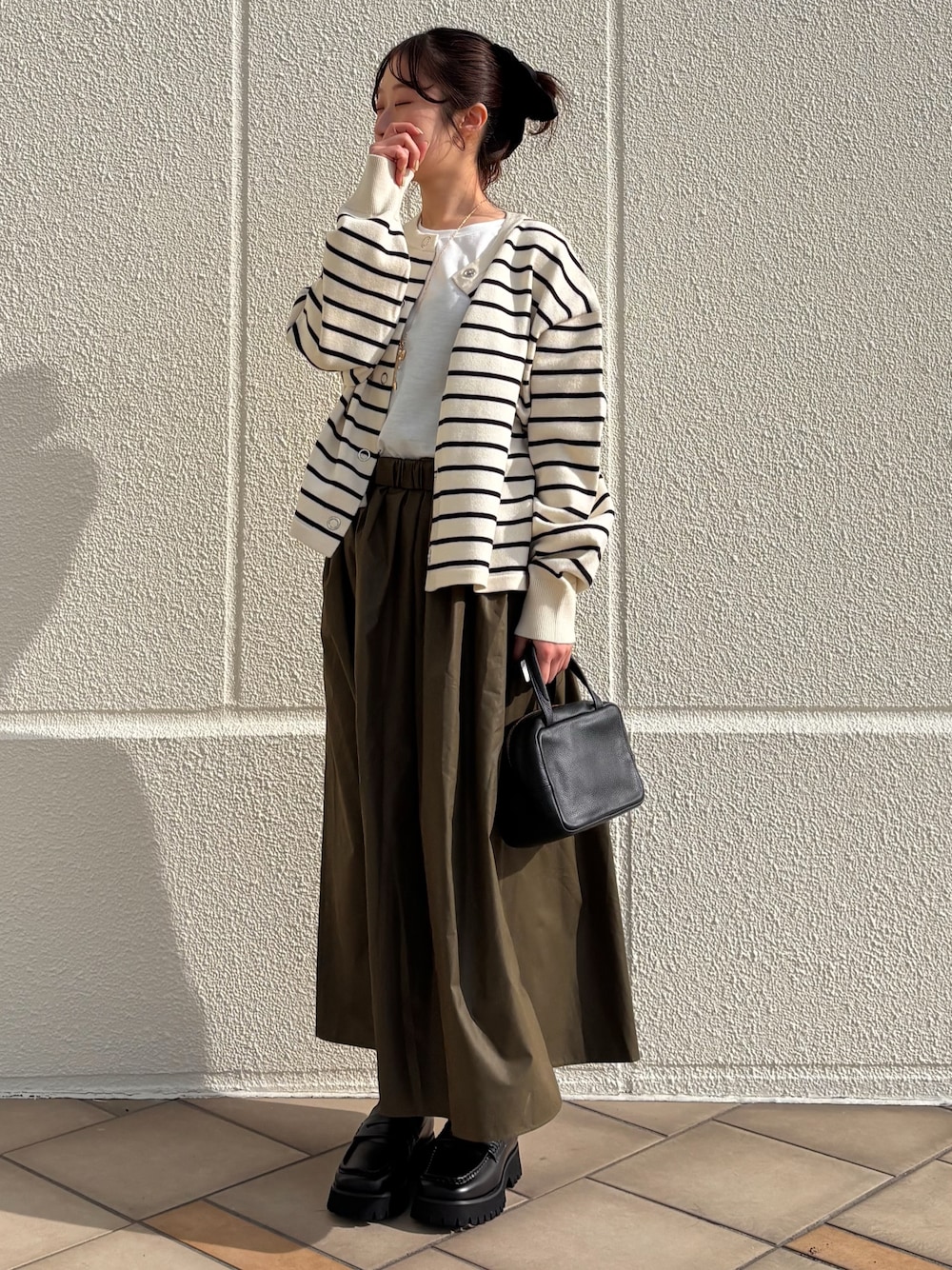 ボトムにはURのワイドパンツ。センタープレスがきちんと見えします。ウエスト回りもスッキリ見えるデザインなのでトップスインしました^^