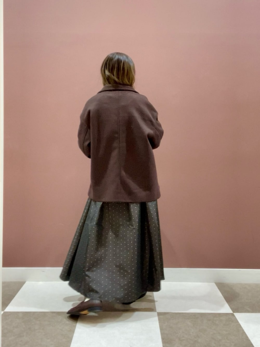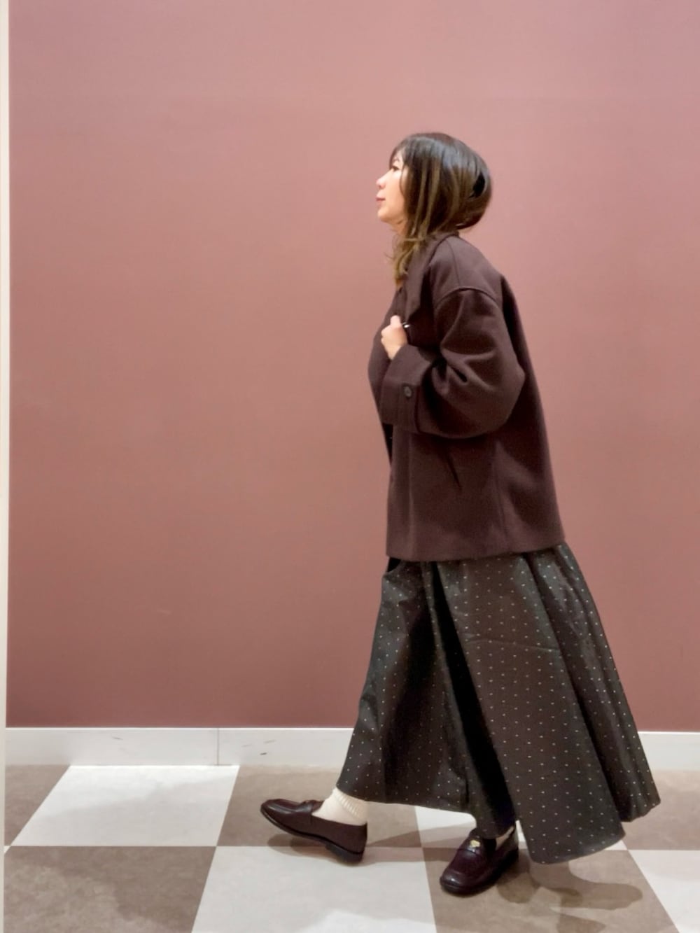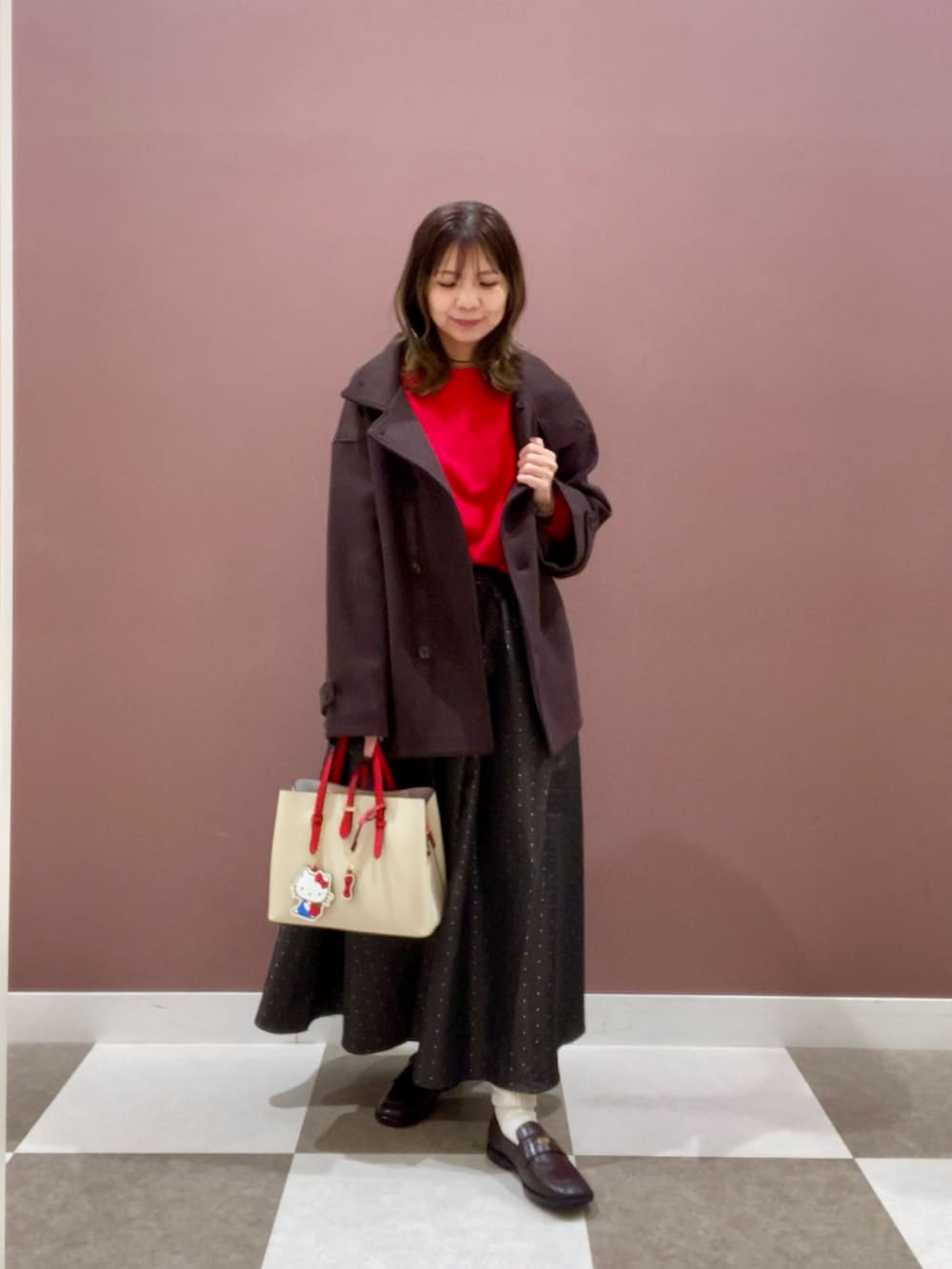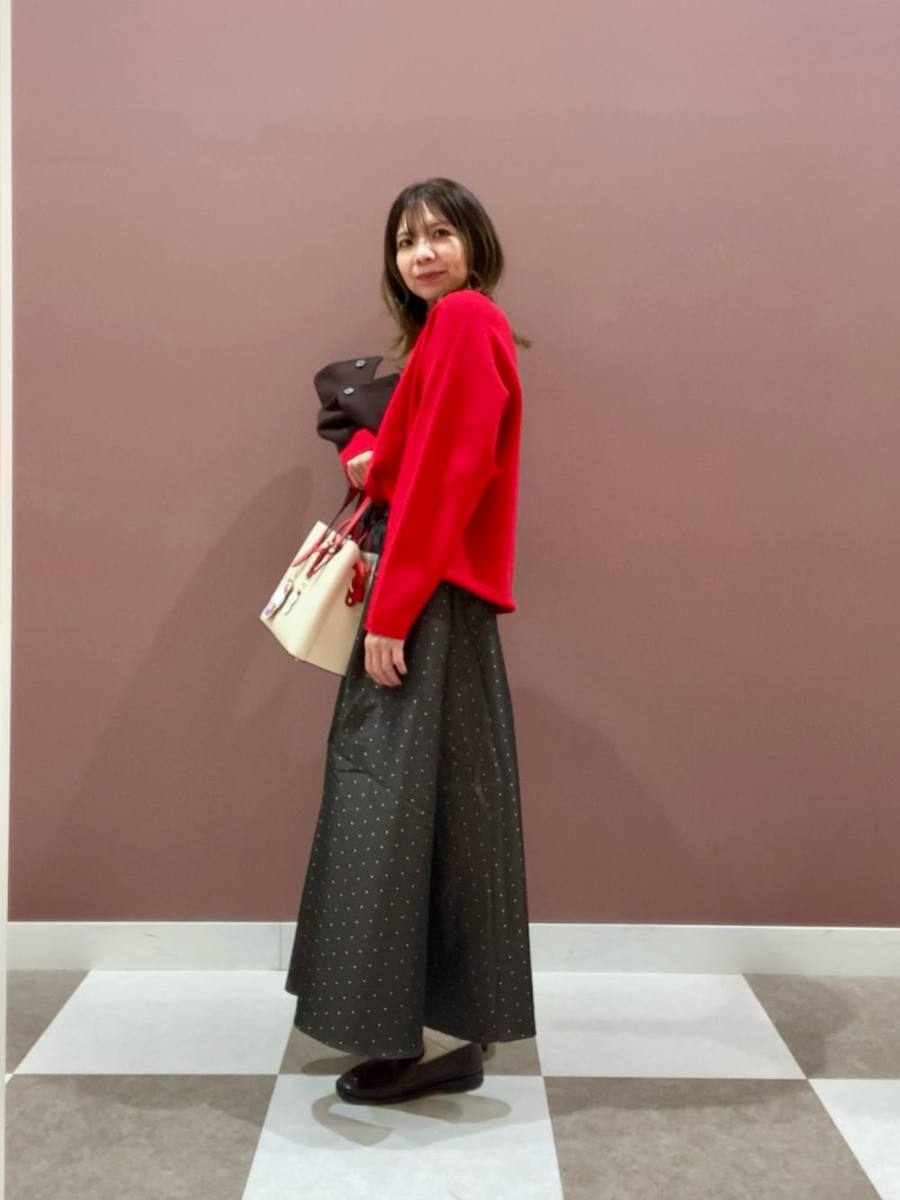 ドット柄のスカートとあわせてお出掛けコーデにしました✨