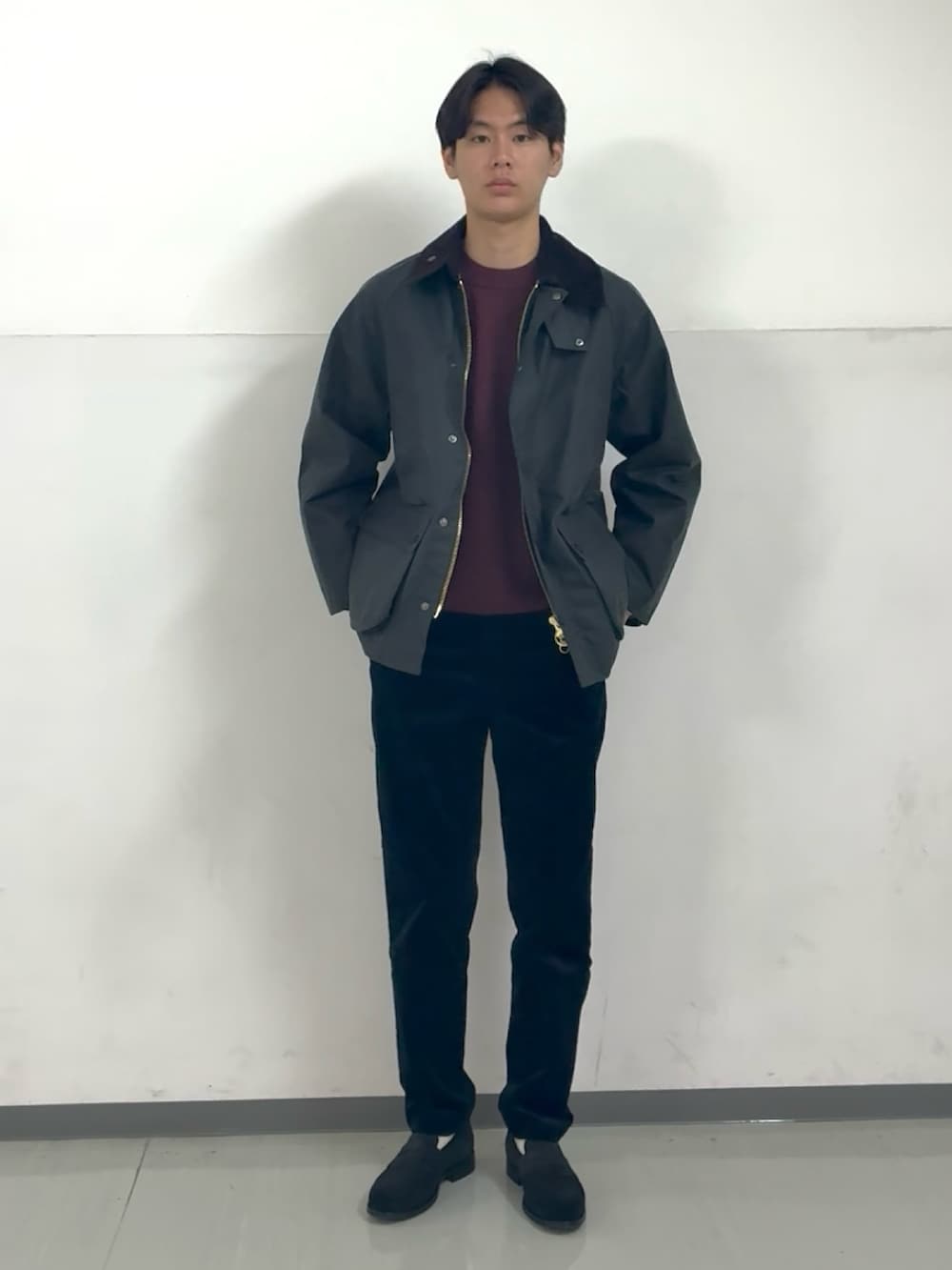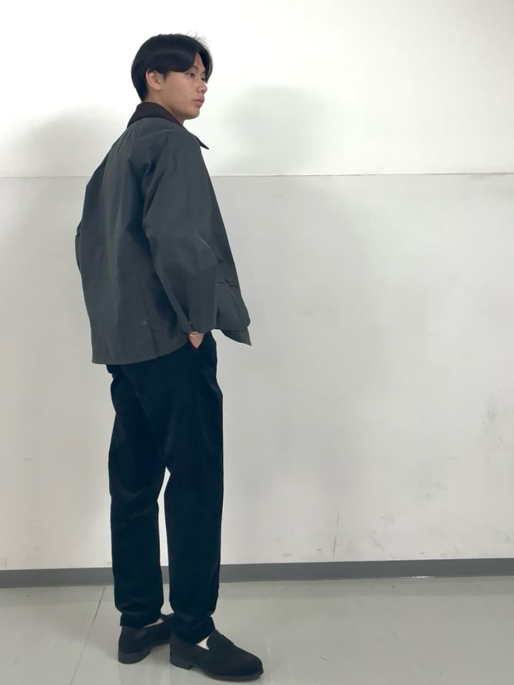 無骨なオイルドジャケットも、色数を絞ることでクリーンに着こなせます。