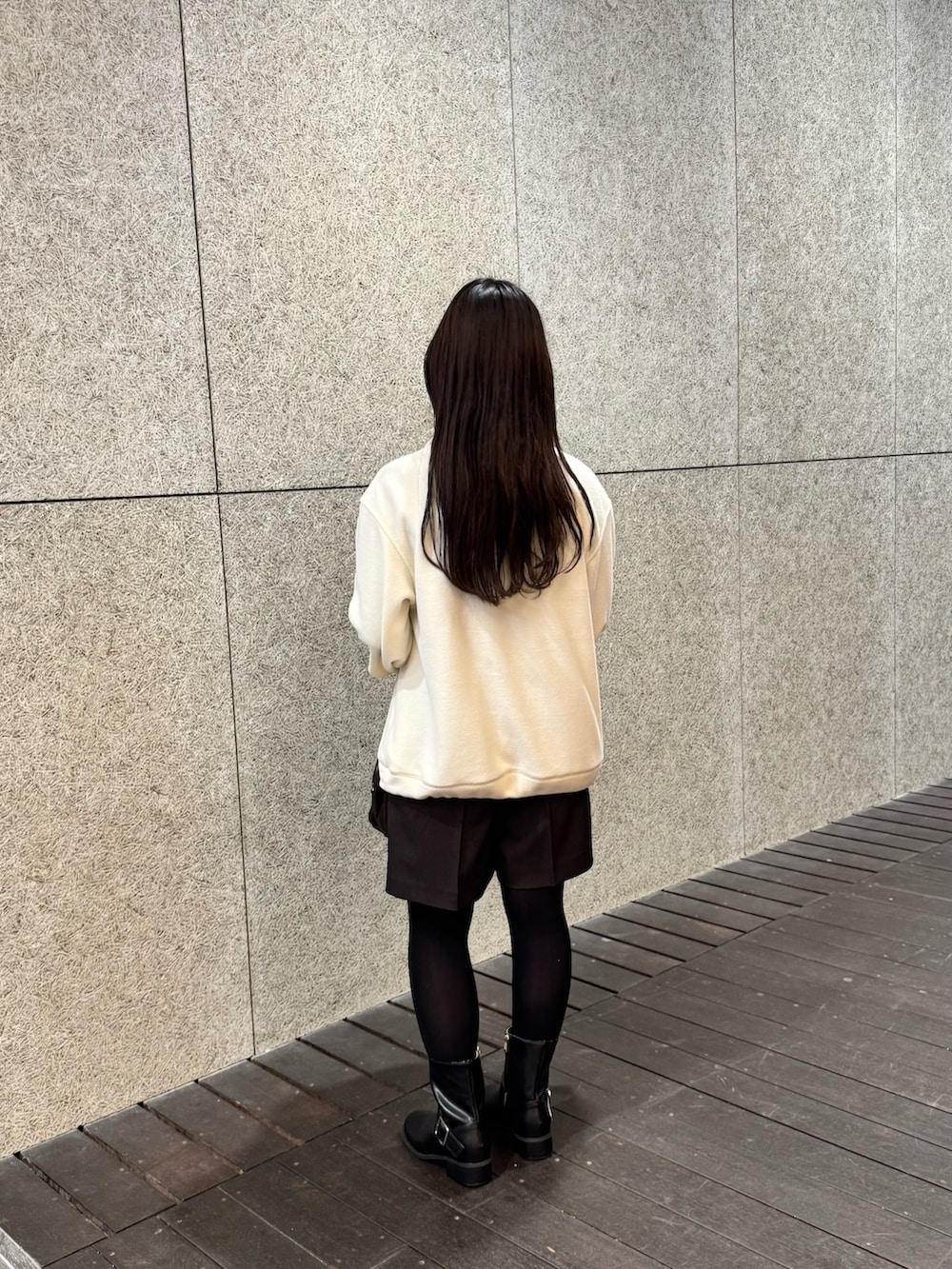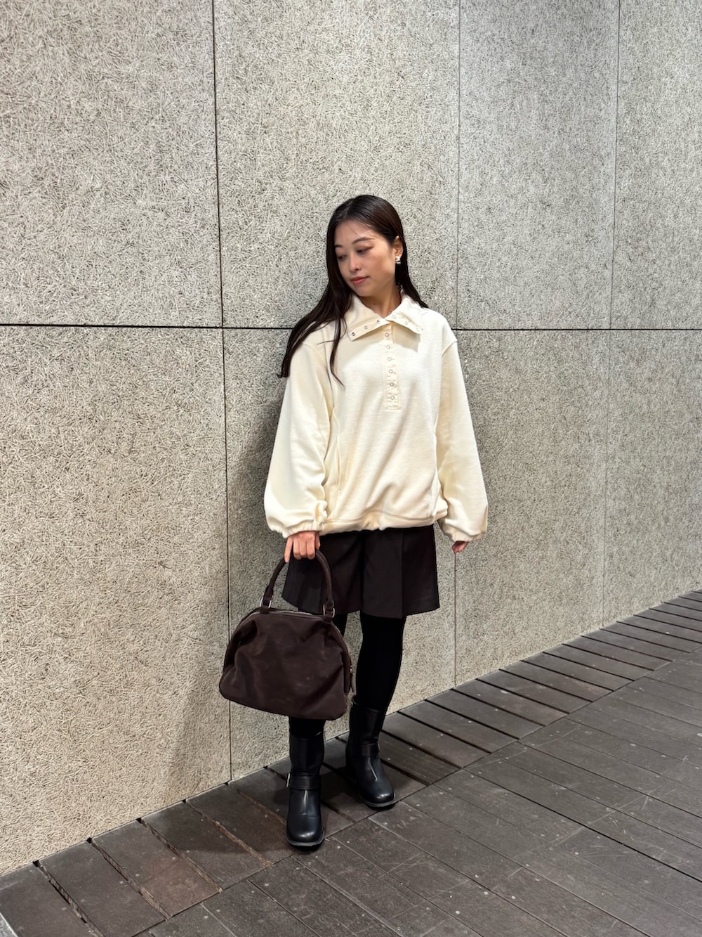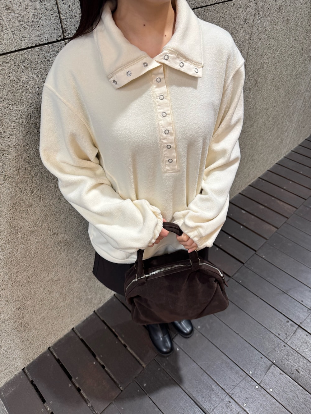 ショートブーツと合わせてスエード素材のバッグを持てばお出かけコーデにぴったりです。