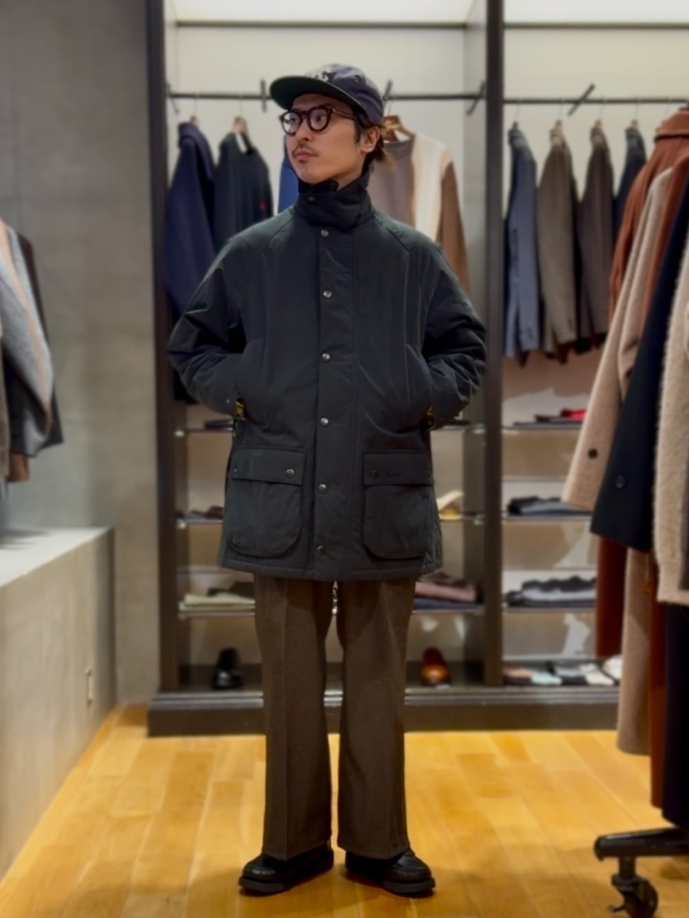 ショート丈のBarbour PADDED TRANSPORT JACKETや、ロング丈のPADDED EXMOOR COATも着用しております。
