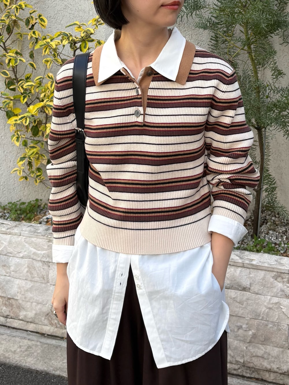 コットンシルクの上質リブが心地よい、マルチボーダーポロニット。