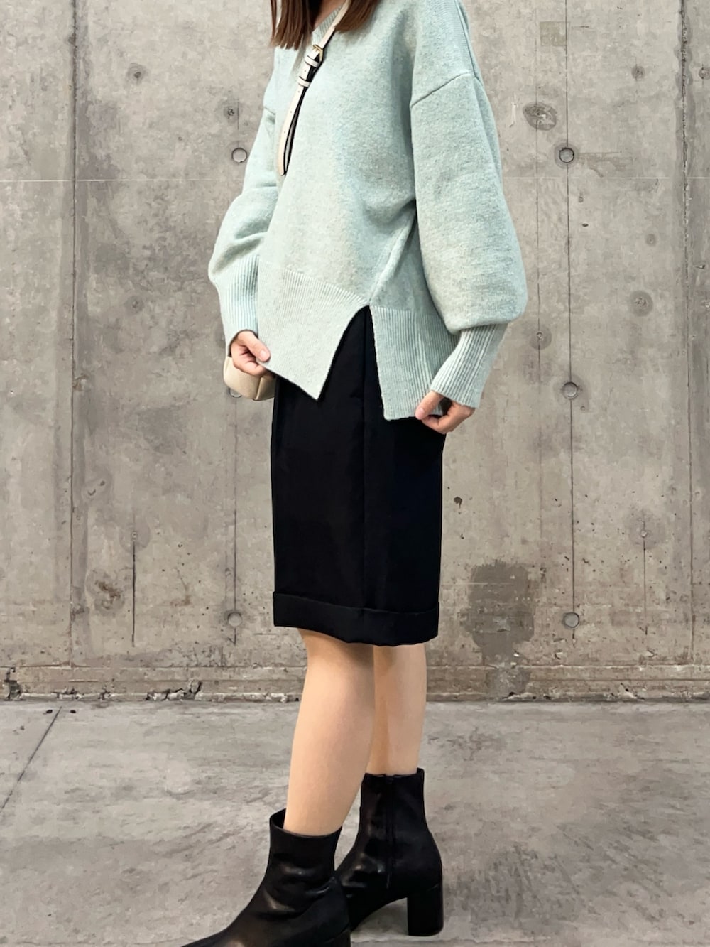 Vネックなので、今の時期はハイネックと合わせる着方もおすすめです