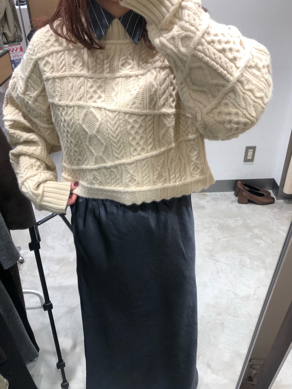 ニットは、シンプルなデザインだからこそ、シャツとのレイヤードコーデをお楽しみいただけます!ショート丈なので、ワイドめなシルエットのスカートやパンツと合わせやすいです!