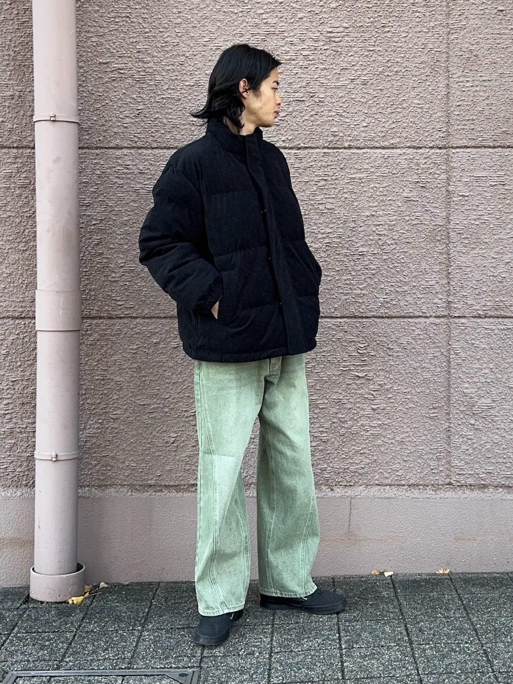 今回のコーディネートはコーデュロイの中綿ジャケットに緑のデニムパンツを合わせました!