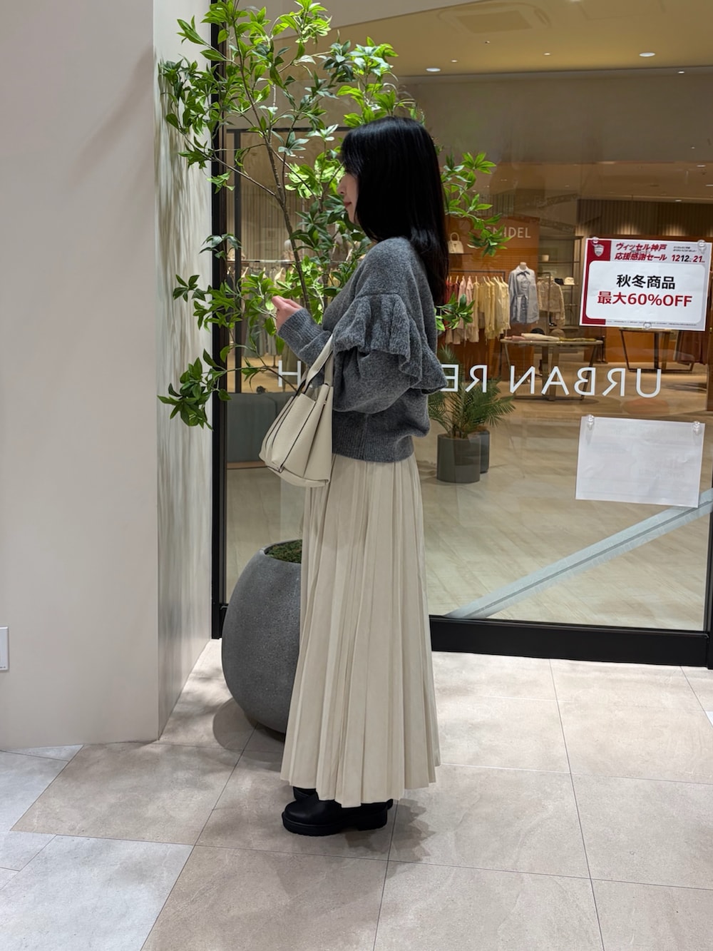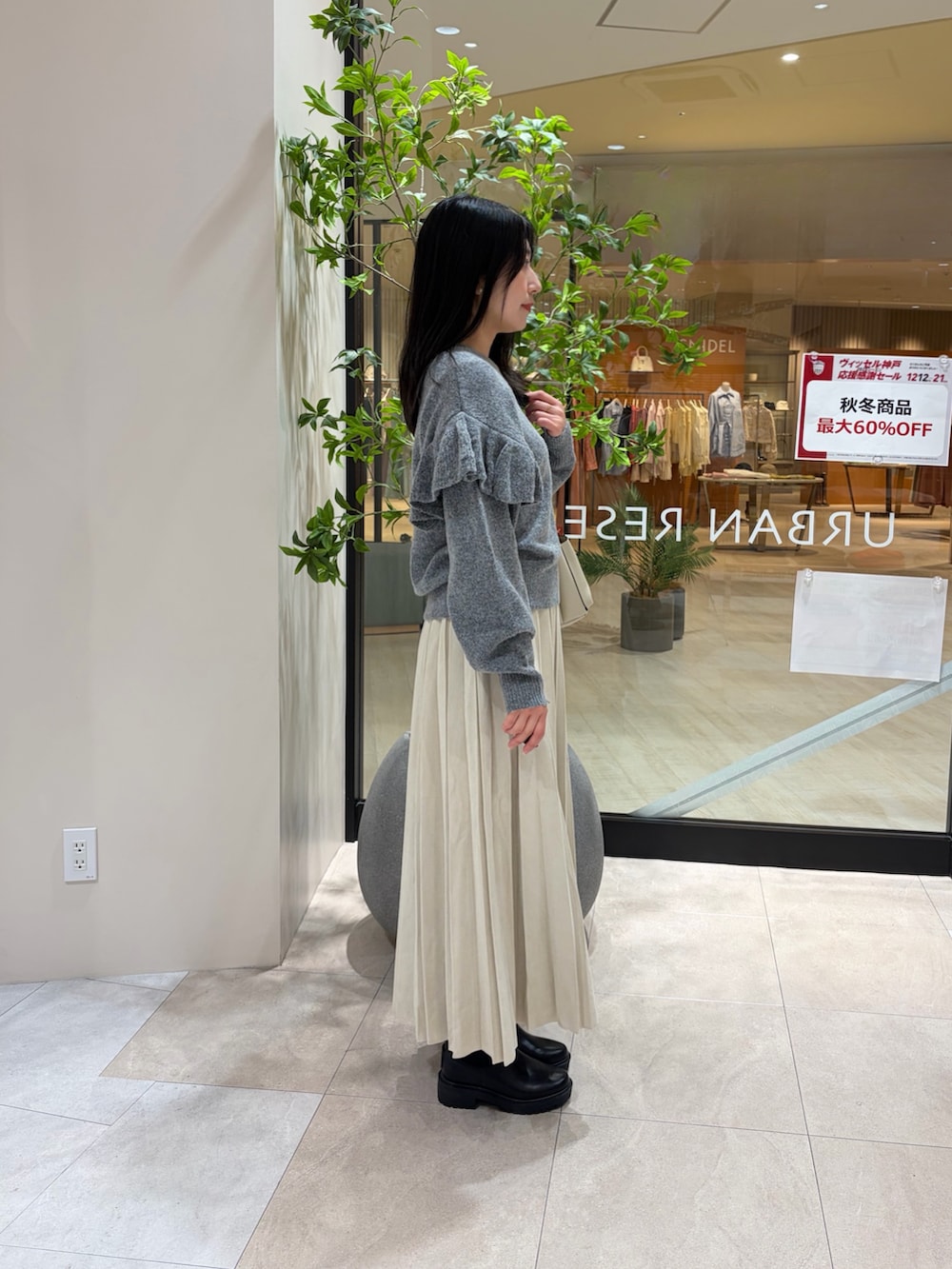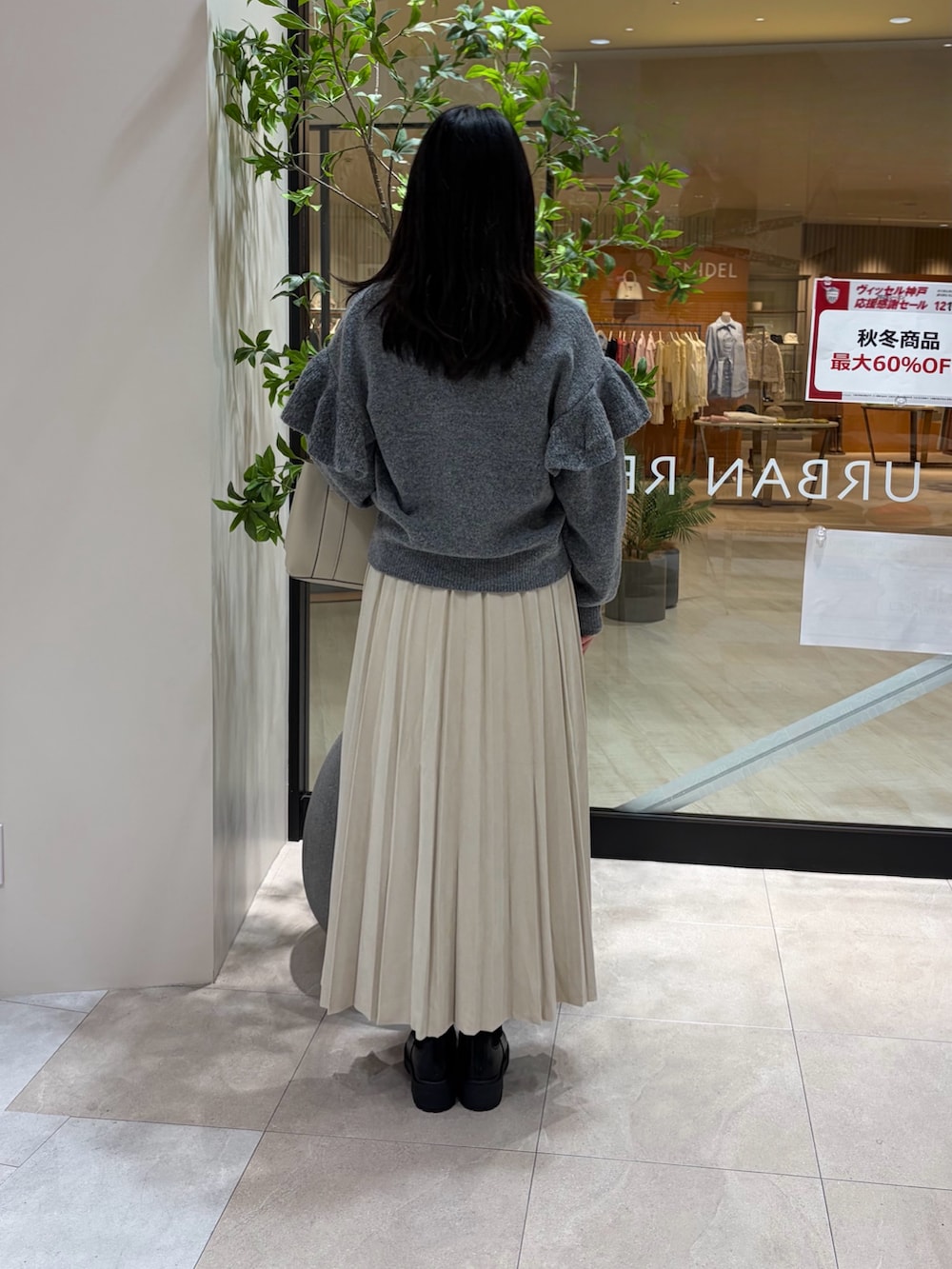 袖のフリルデザインがポイントのニットです☺️スカートでもパンツでもどちらも合います😃