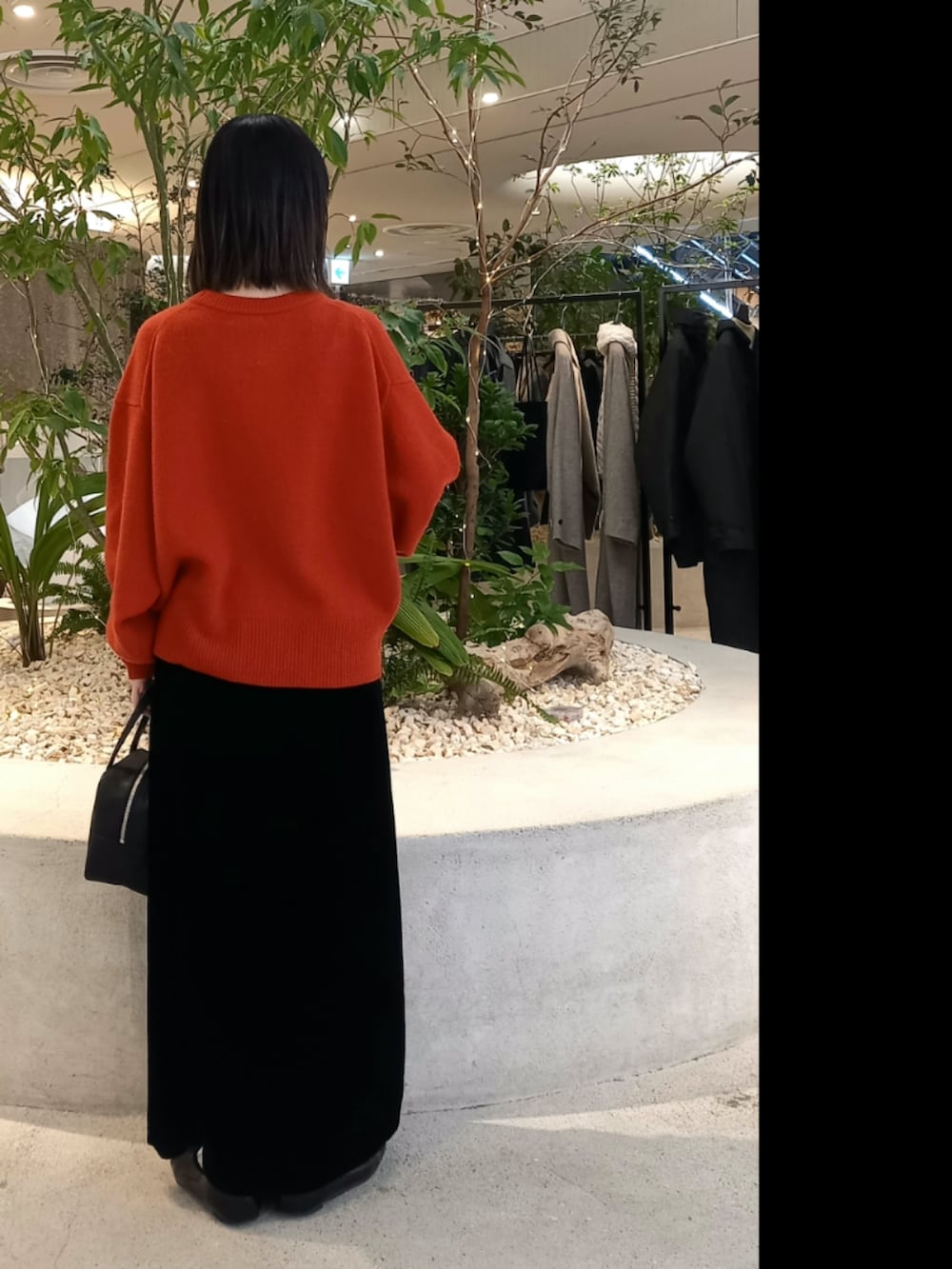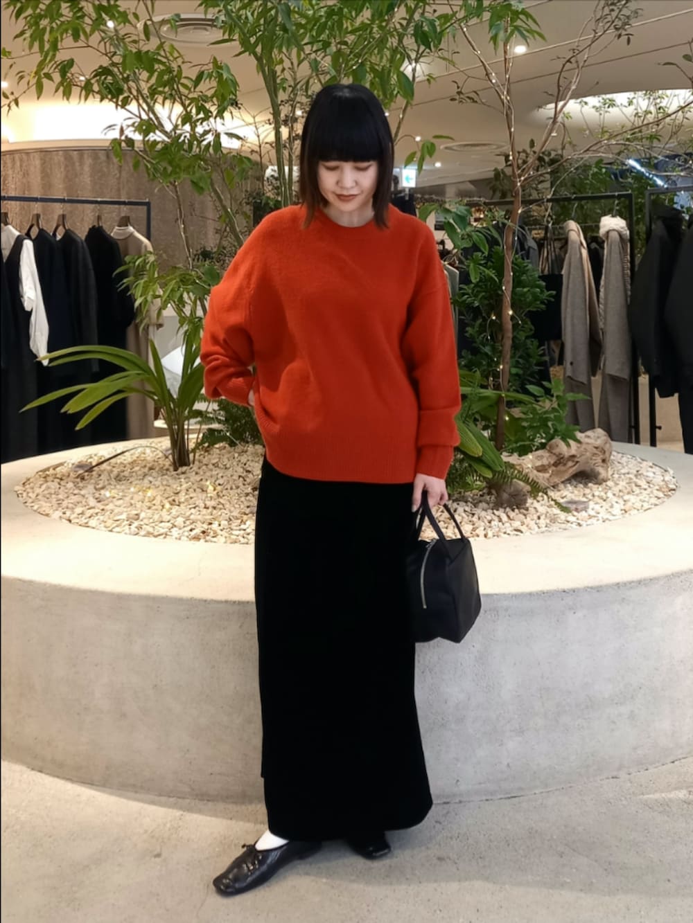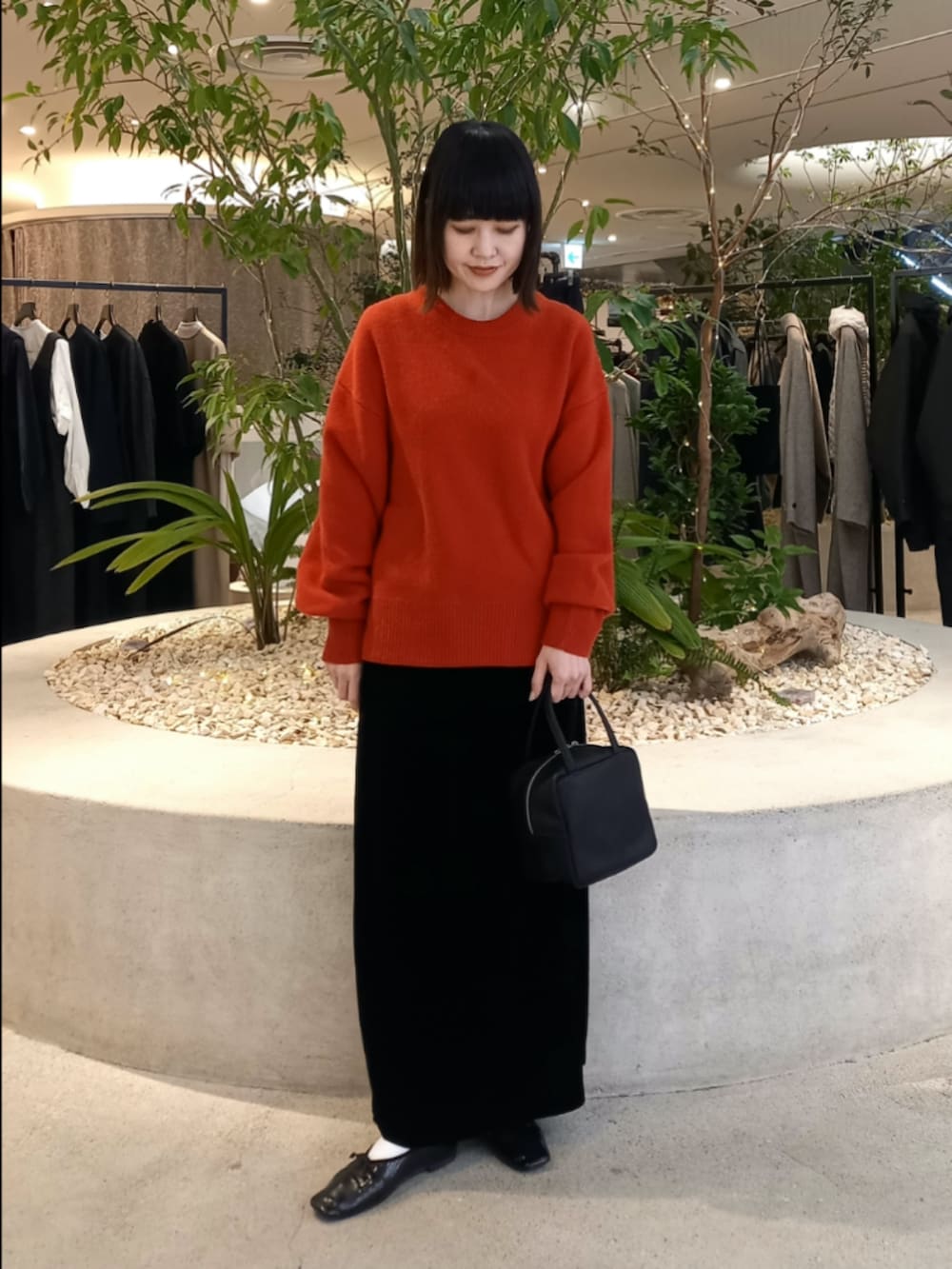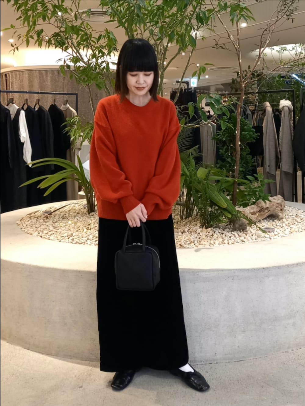 艶感のあるベルベットのスカートを合わせて上品な雰囲気に◎