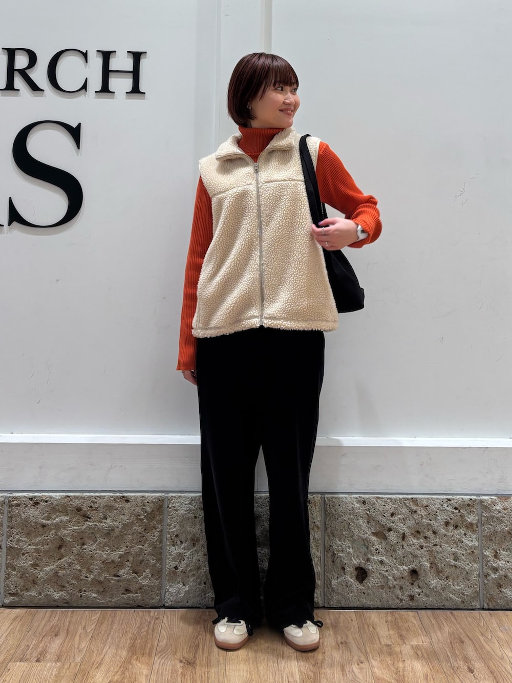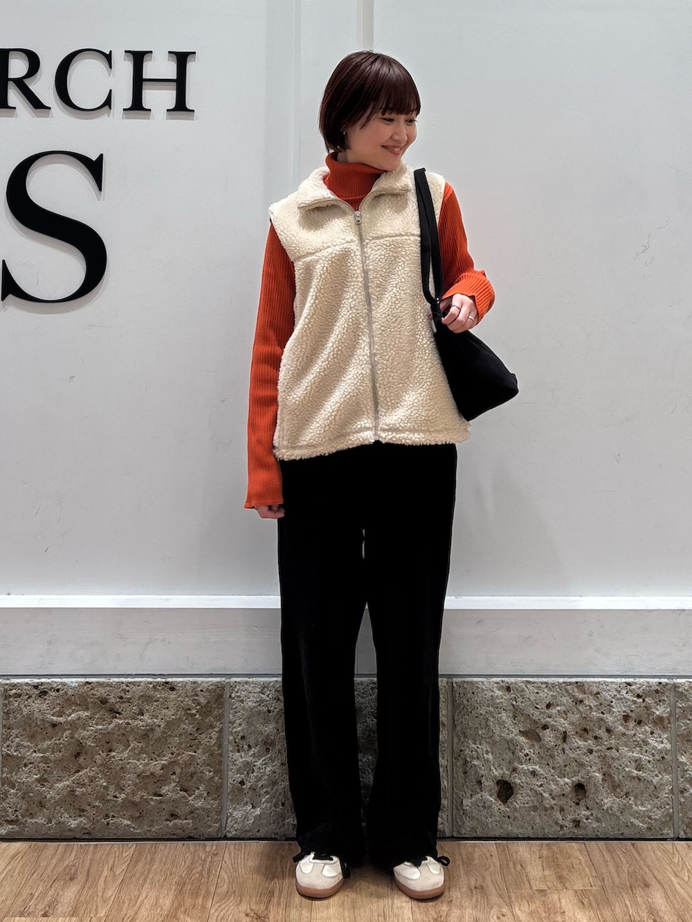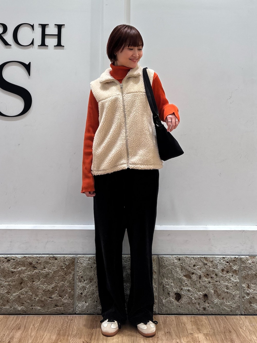 オレンジ色のタートルネックを白ベストと合わせてみました。色味が落ち着いているので可愛らしすぎず着こなすことができますよ◎