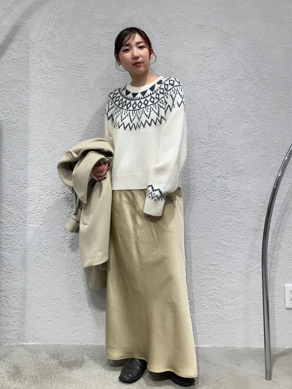 ノルディックニットは柄が黒ではなくグレーなので、アウターの柔らかいカラーと喧嘩せず全体的に優しい色合いのコーデにまとまっています✨