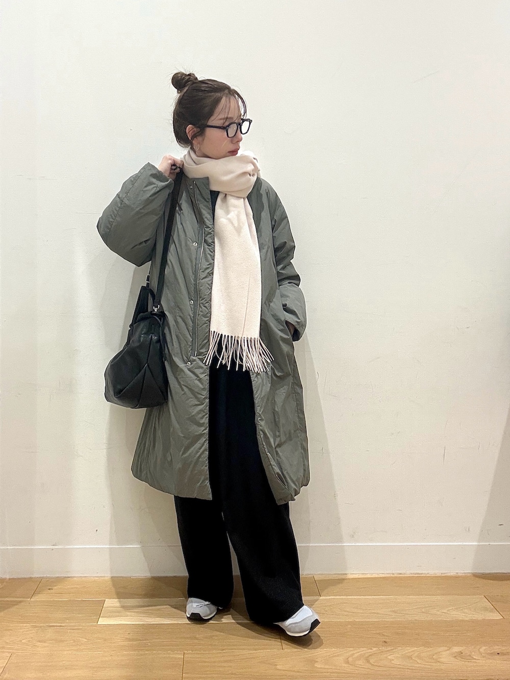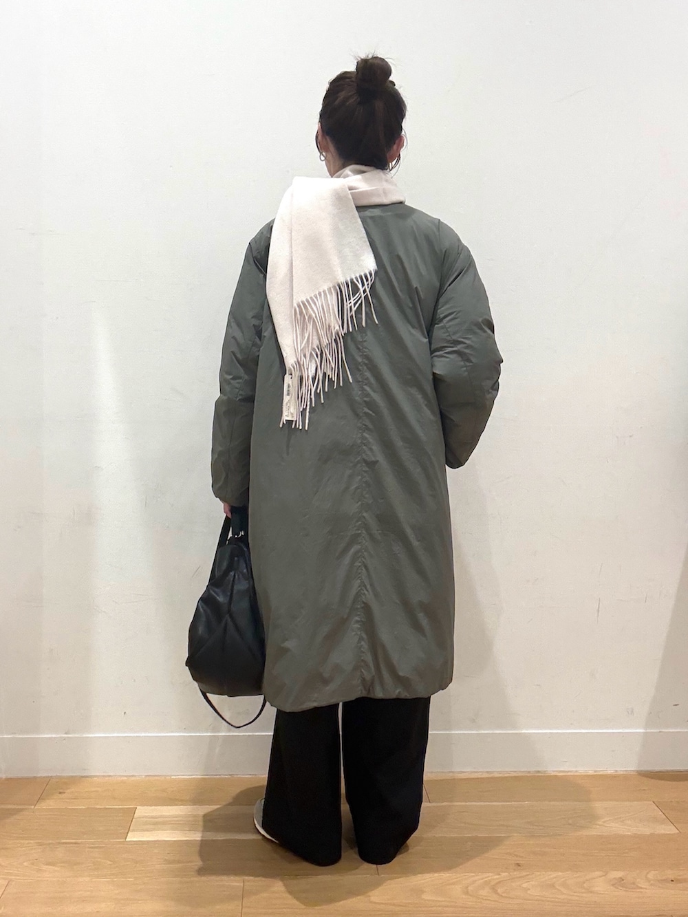 きれいめカーキが目を惹くノーカラーの中綿コート+清潔感のあるやわらかいオフホワイトのカシミア混ストールで首元の防寒・全体のカラー配色もバッチリです✨☃️