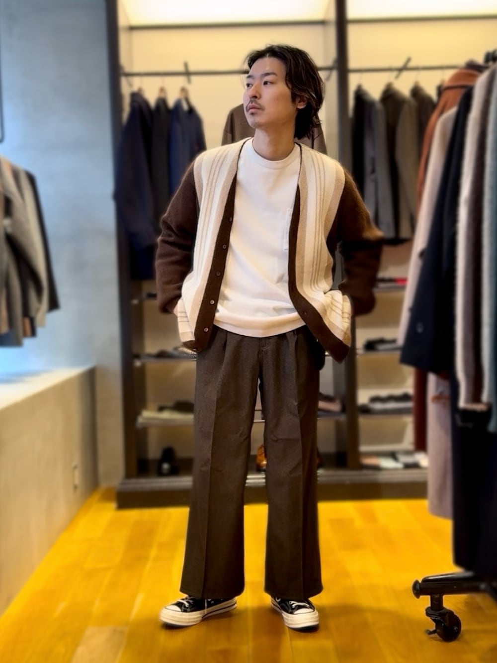 ブラウンベースのストライプカーディガンにブラウンのボトムを。
