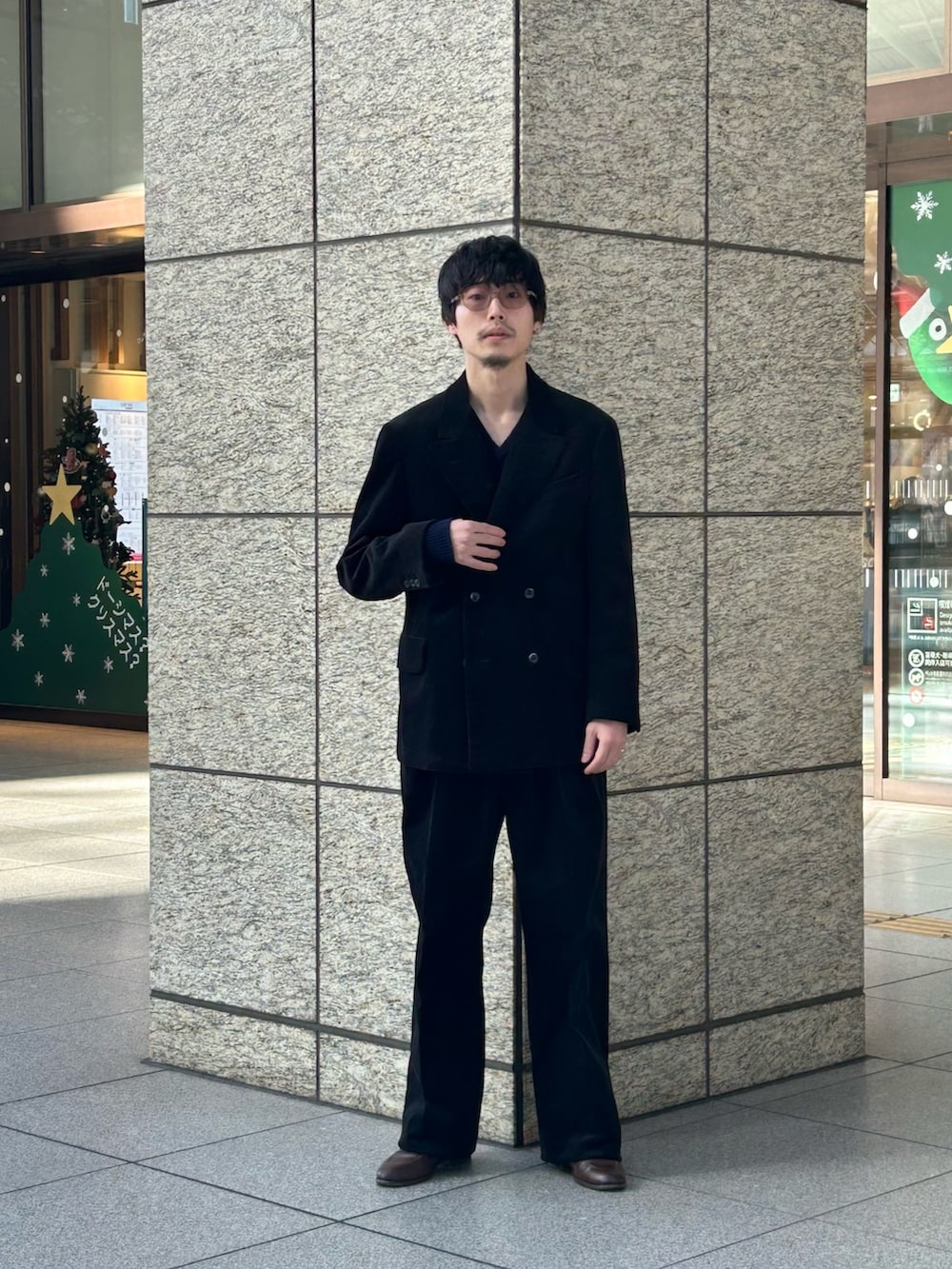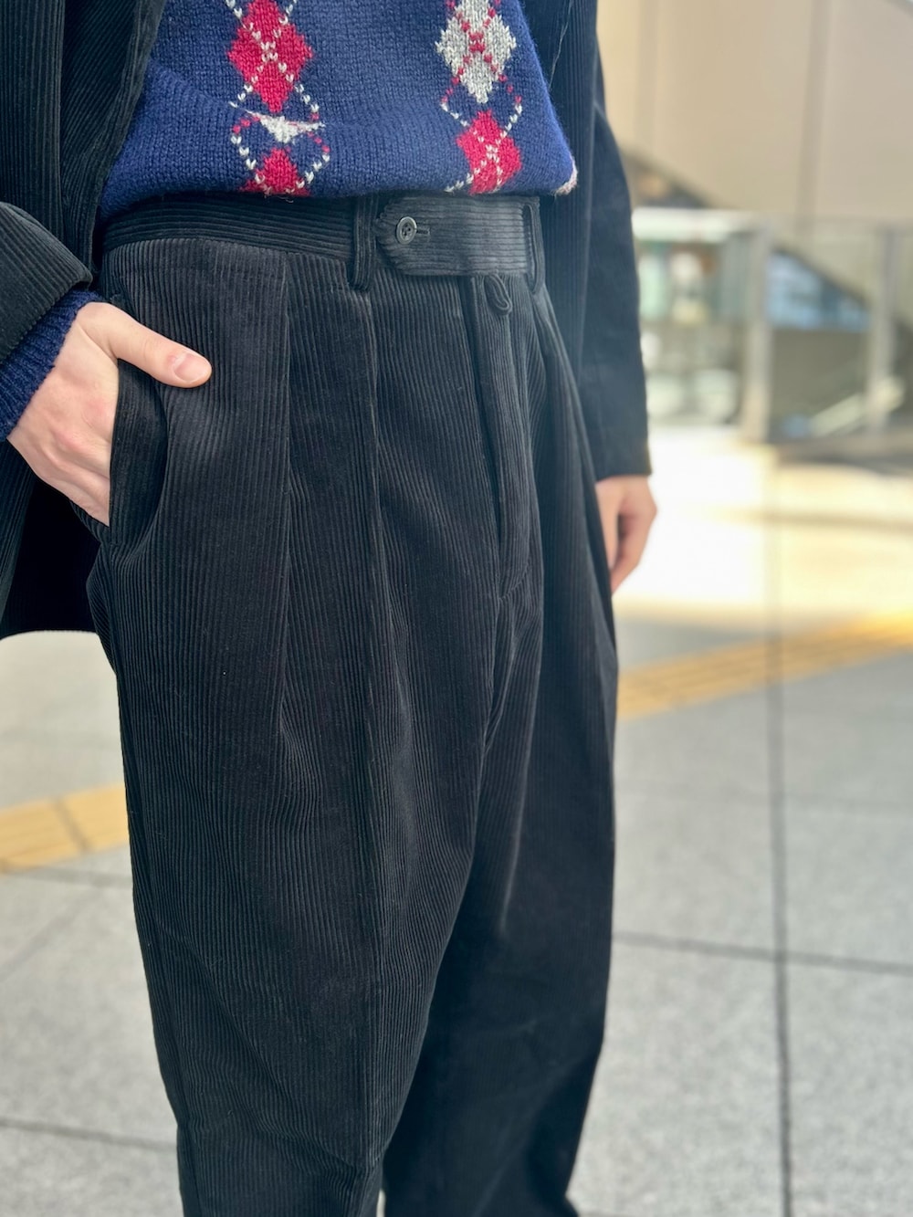 収まりのいいようで多国籍なセットアップを、今回はブラックコーデュロイでしまった印象に。