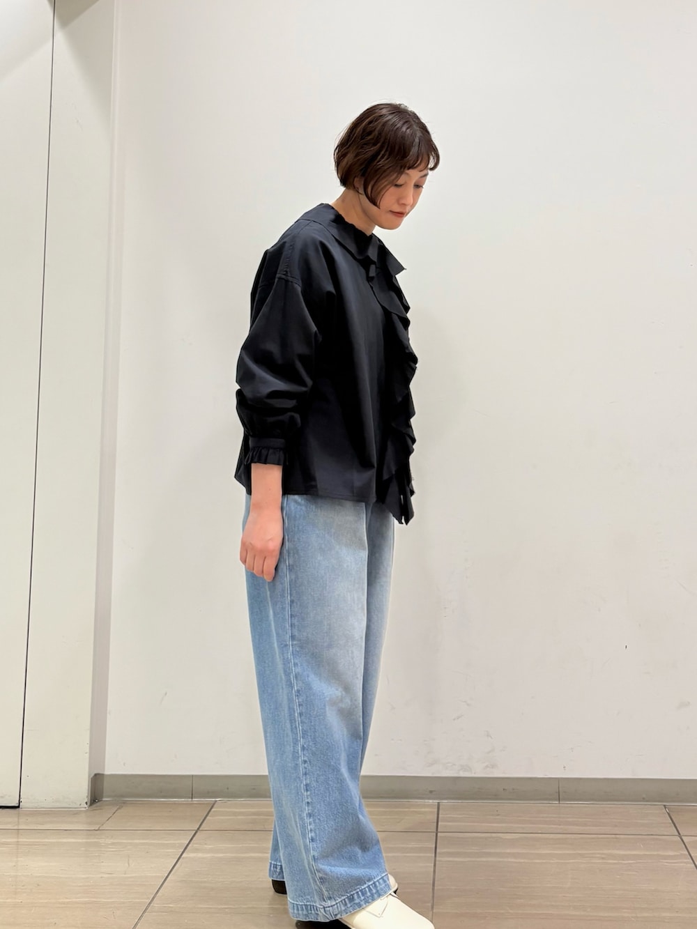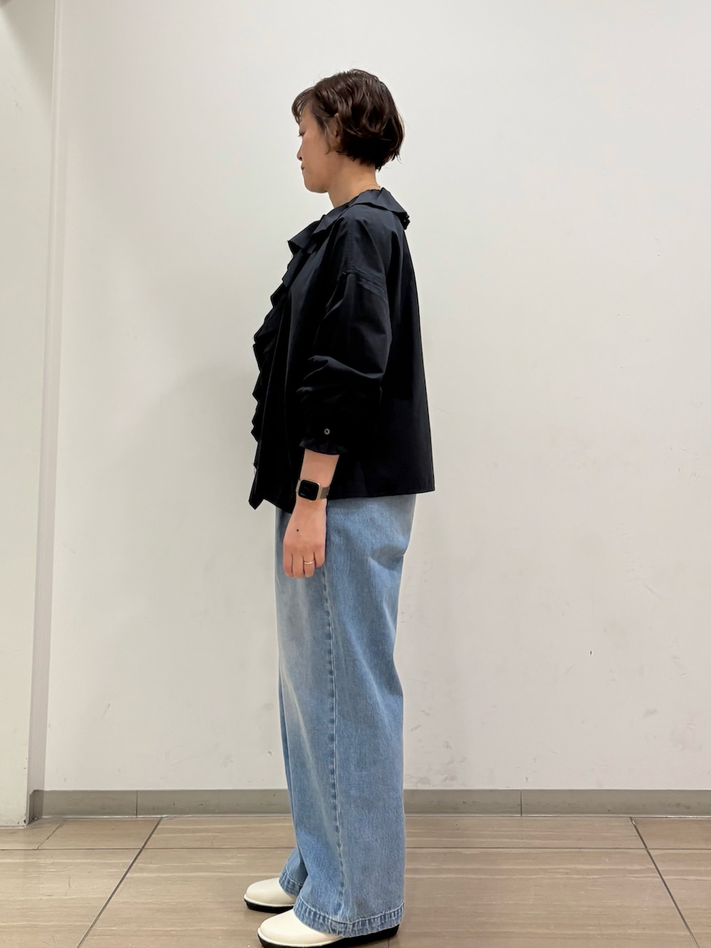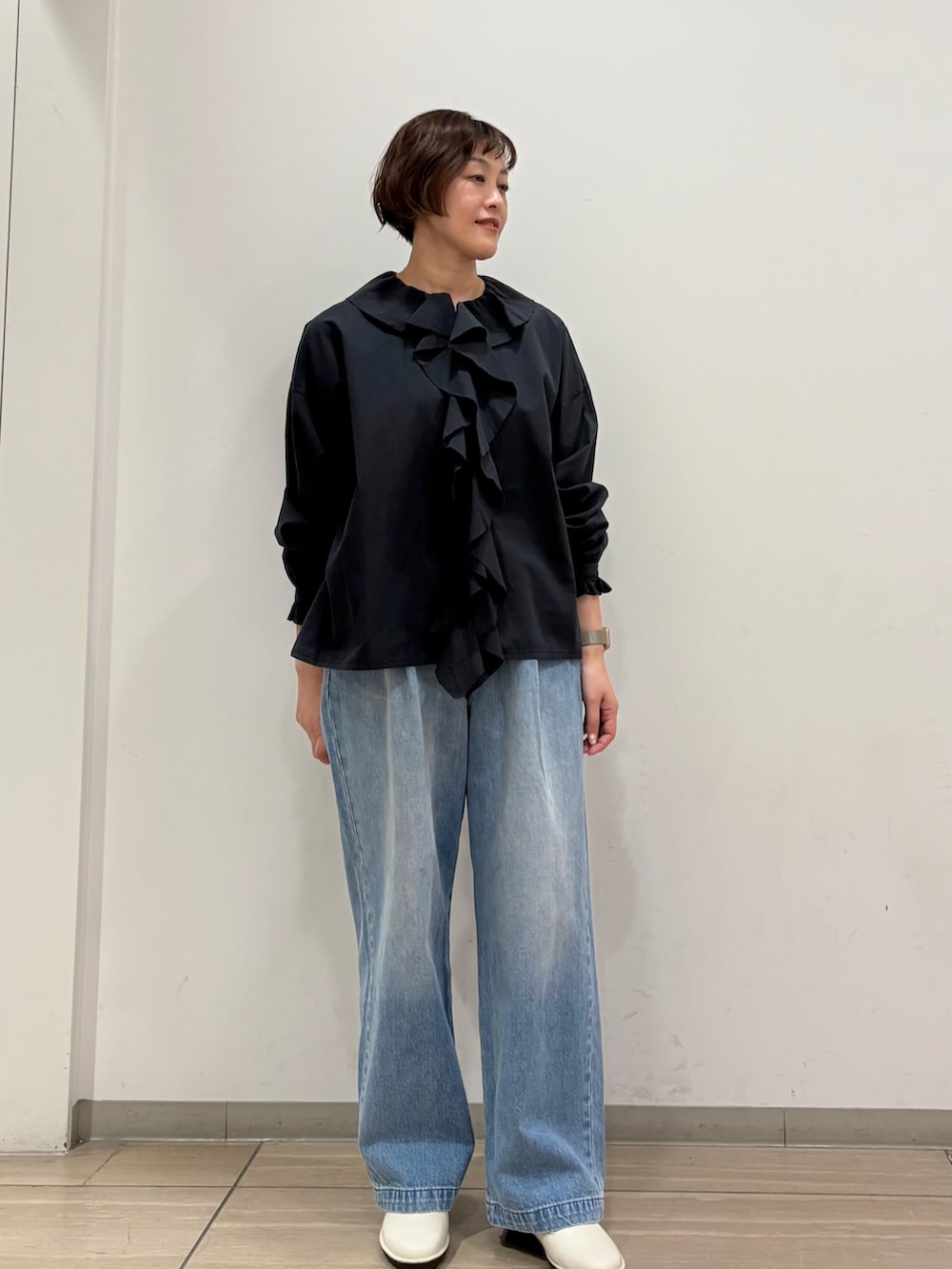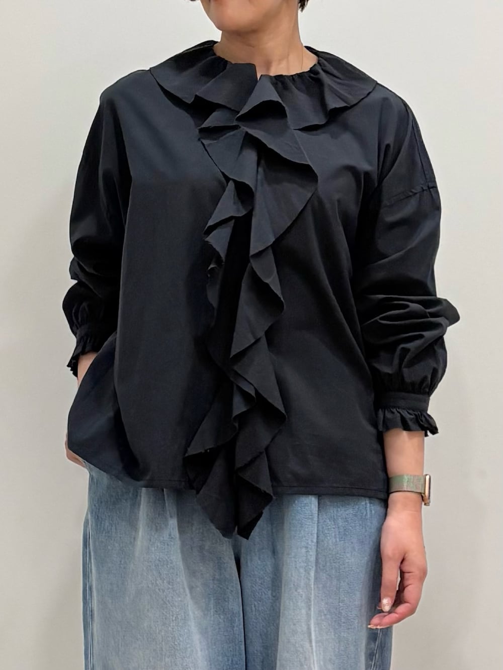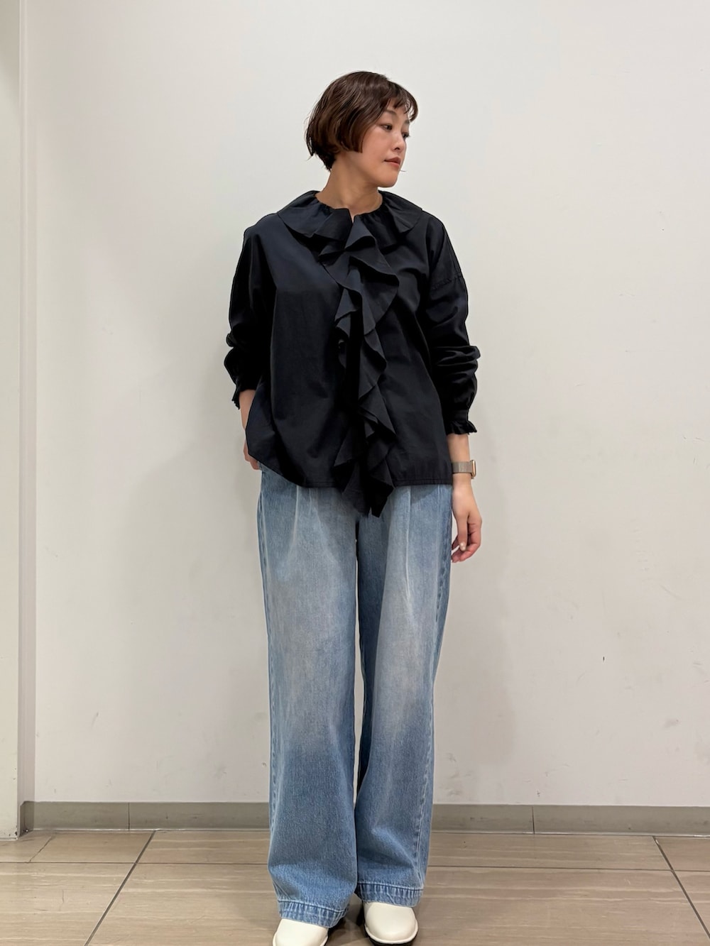 フリルシャツはcharcoalで、カジュアルにデニムに合わせて頂くと、甘さ控えめで大人可愛い着こなしで着て頂けます。