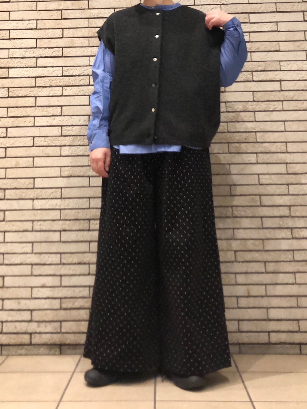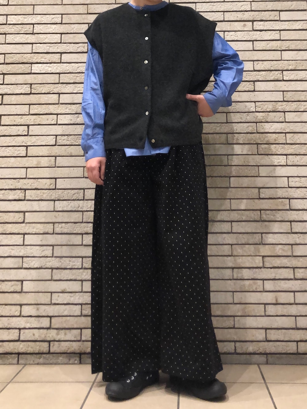 パンツは小ぶりでさりげないドット柄のワイドパンツです。すっきりとした細畝が、カジュアルな中にも上品さを◎ワイドながらも膨らみすぎず、トップスとバランスが取りやすいです。