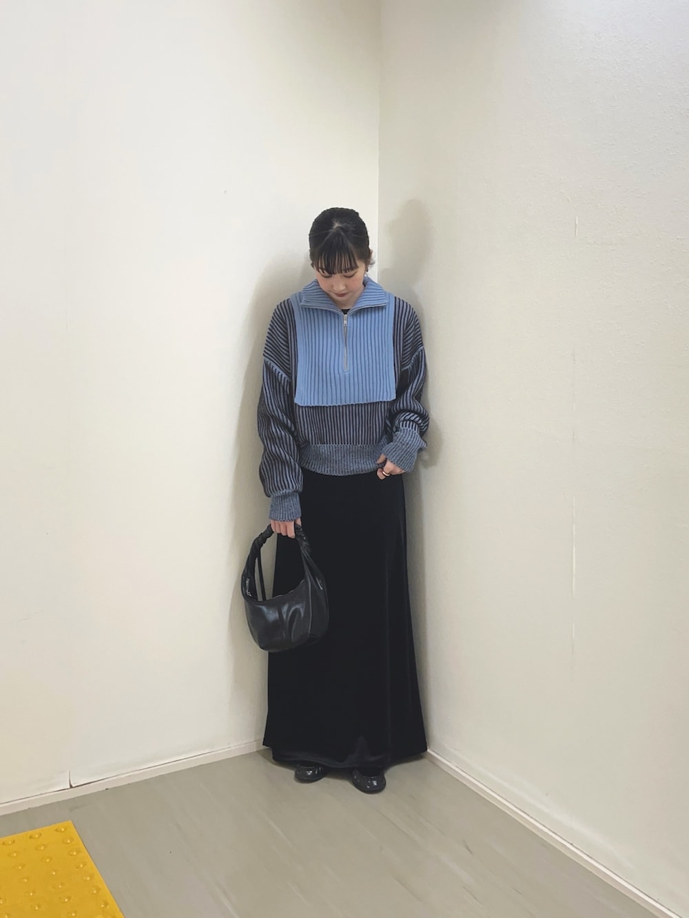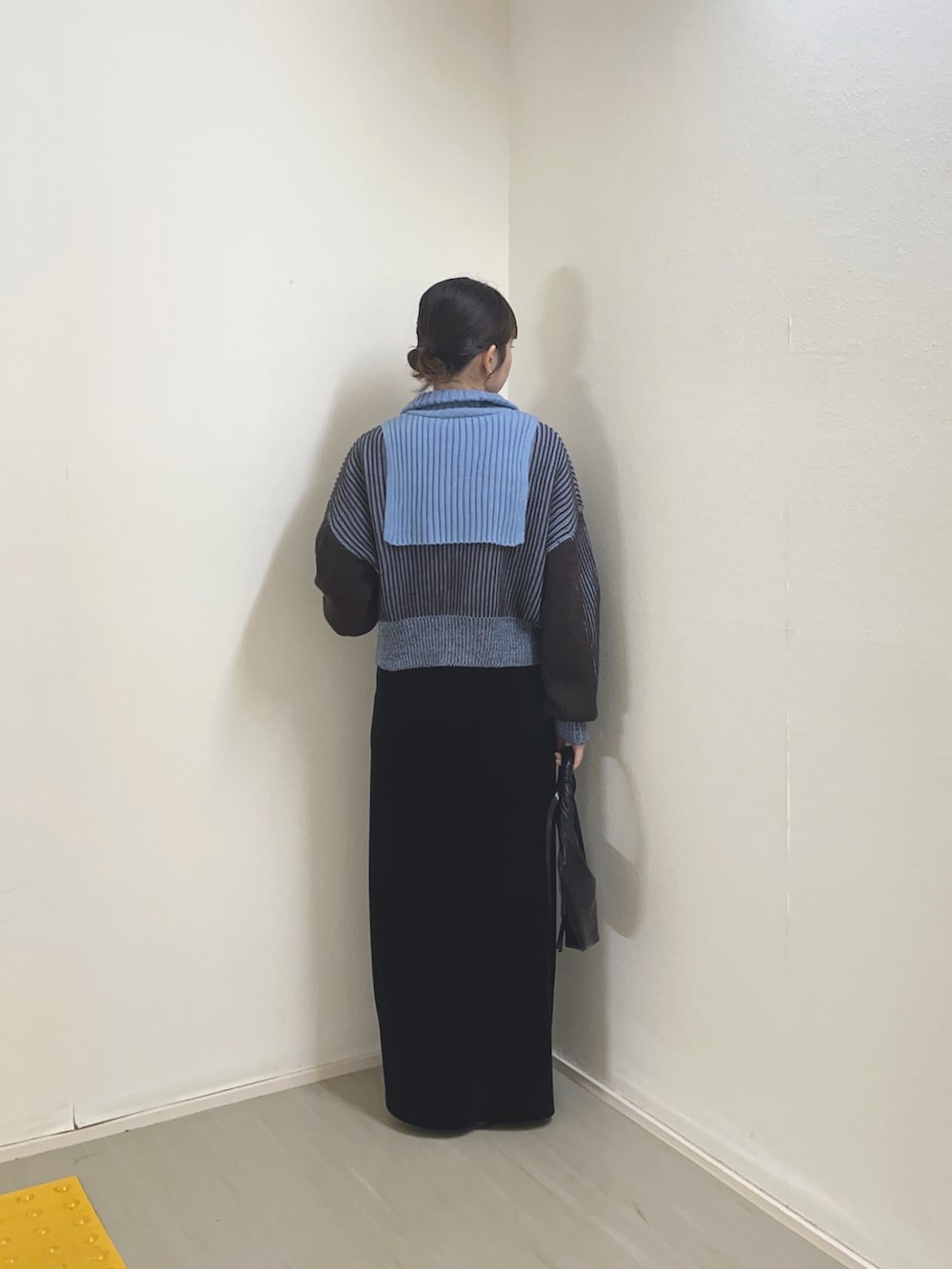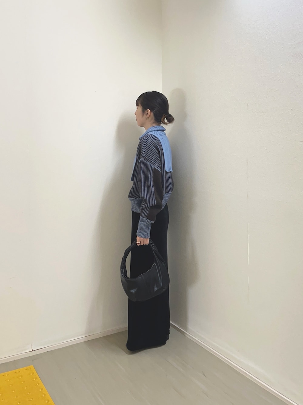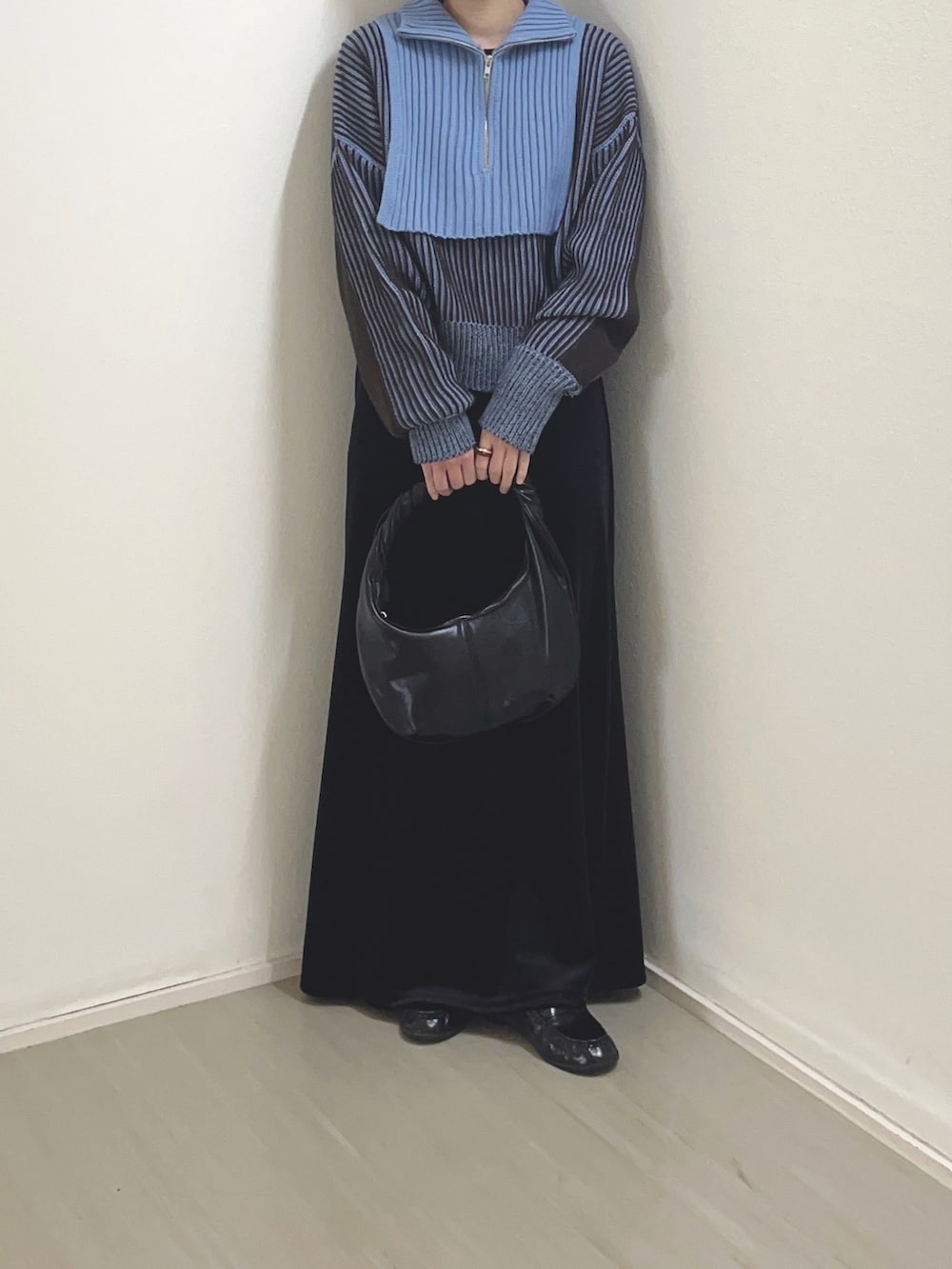 小物やボトムスを黒で統一することで
