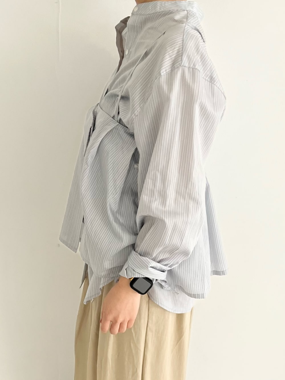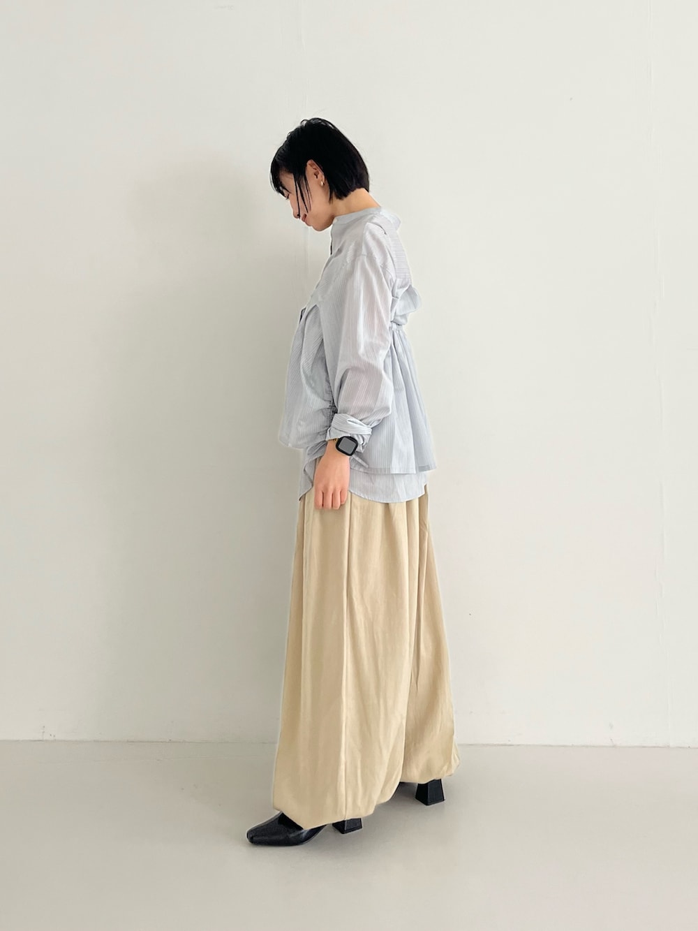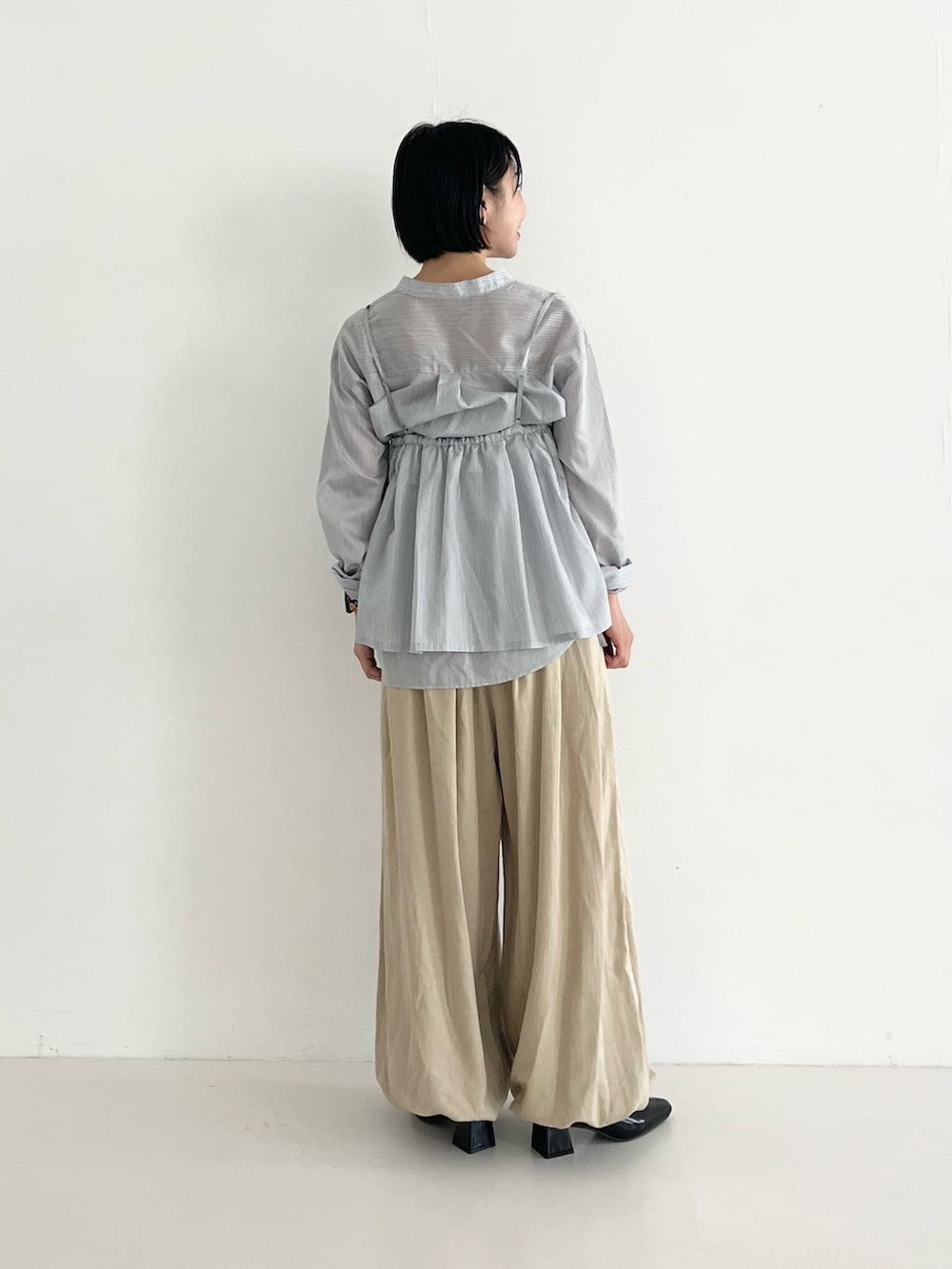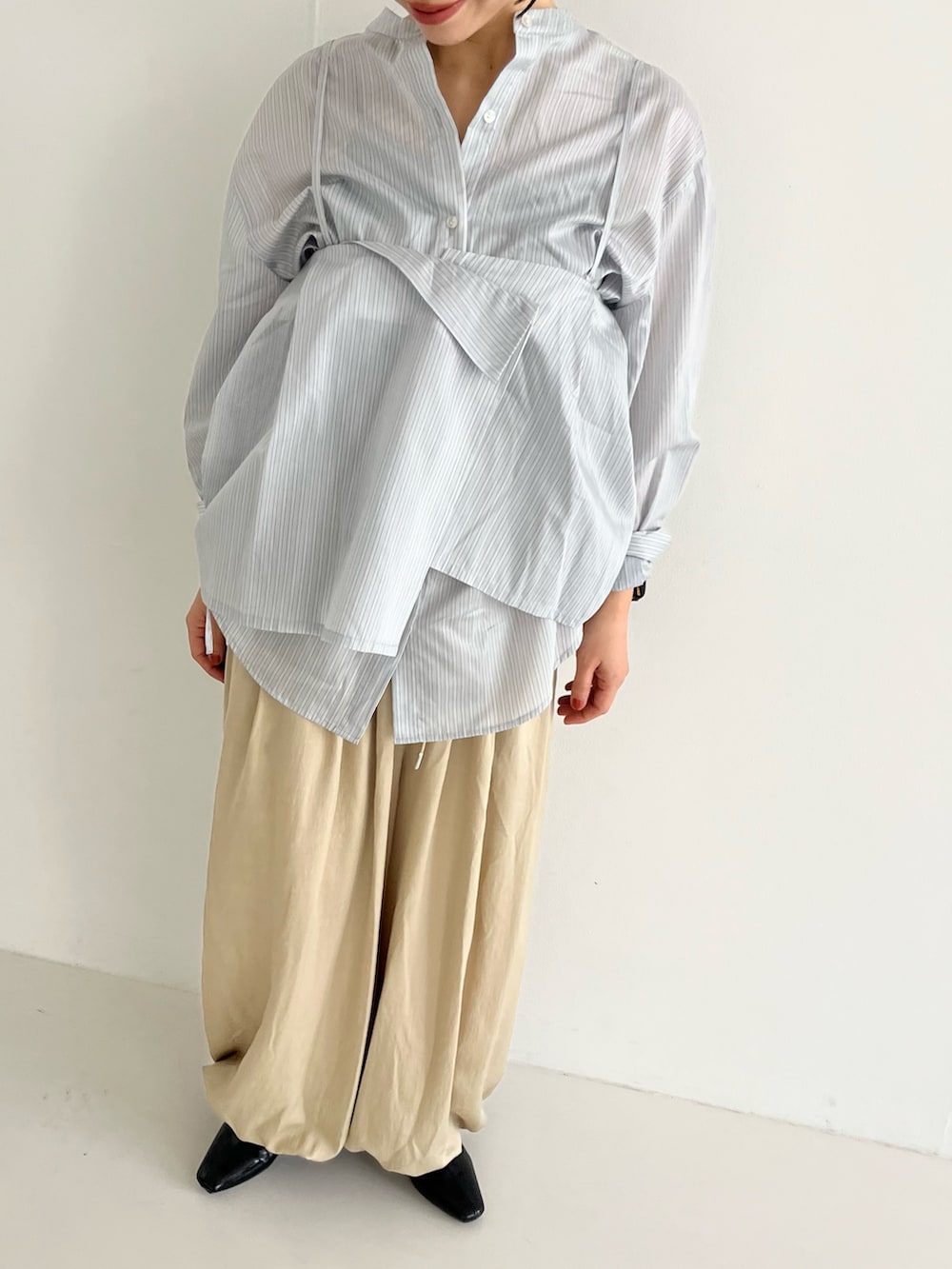 ビスチェでもスカートでも使えるシャツは着回し抜群です!淡いトーンで春らしくまとめました。パンツは裾がしぼられているので、157センチでもずらずに履いていただけます。