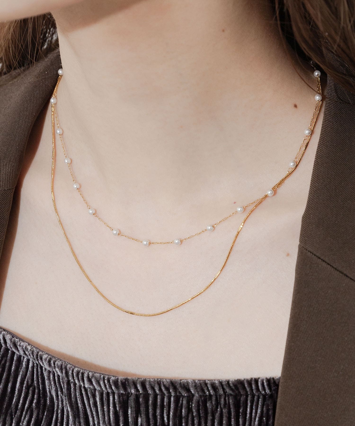 SMELLYステンレスパール2レイヤードネックレス- 着用カラー: