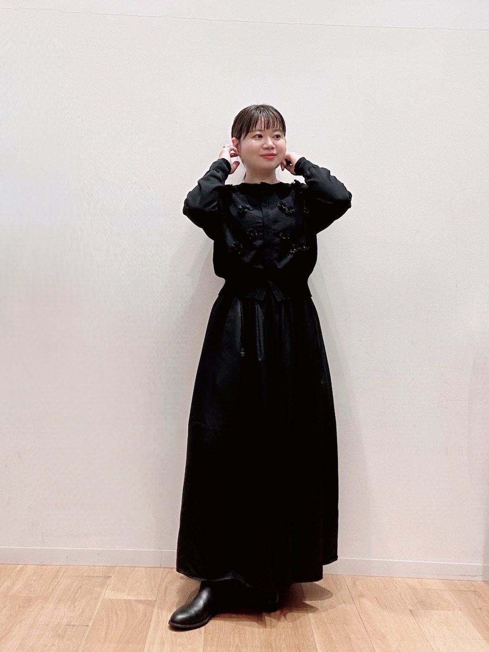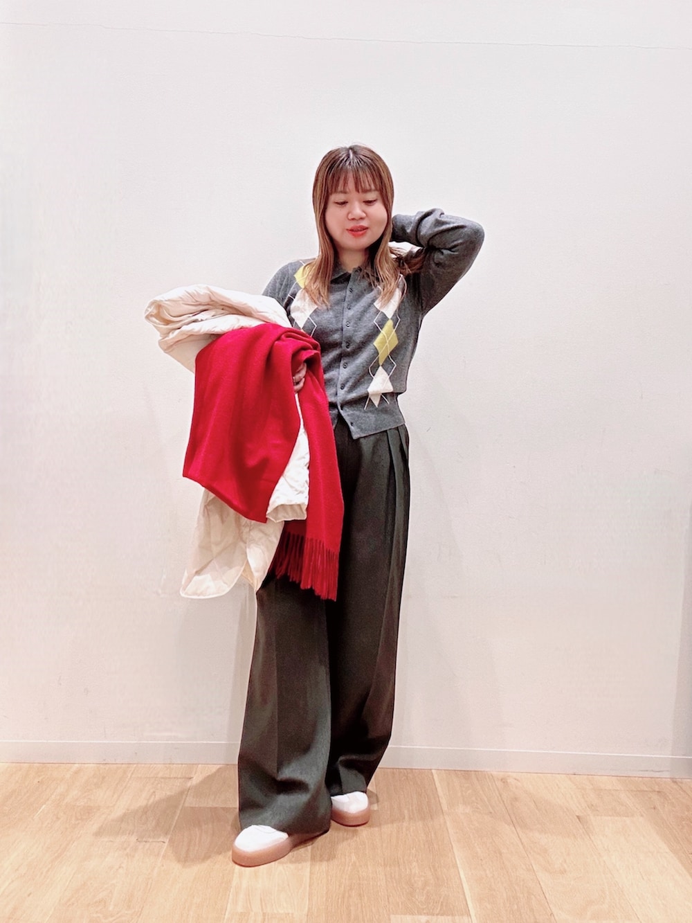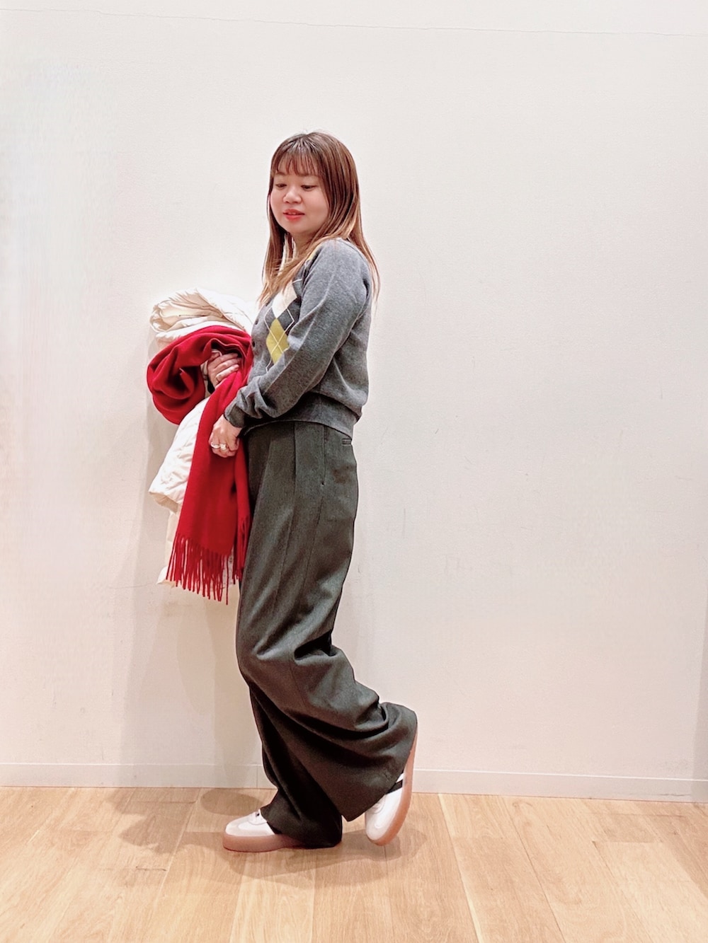 ニットとボトムはグレーカラーで統一🩷