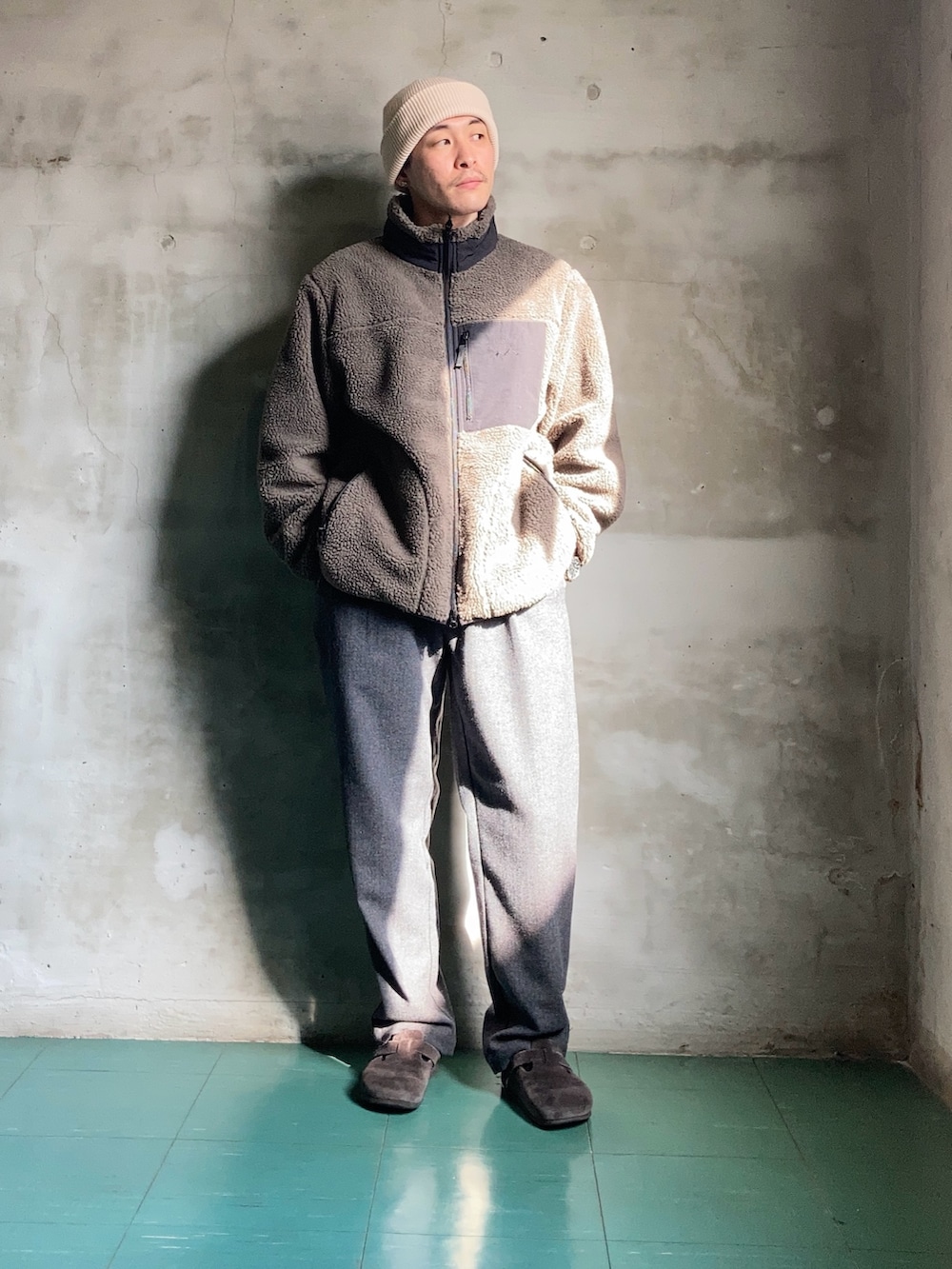 防風性に優れたフリースJKTと、ウールのイージーパンツでラフに。