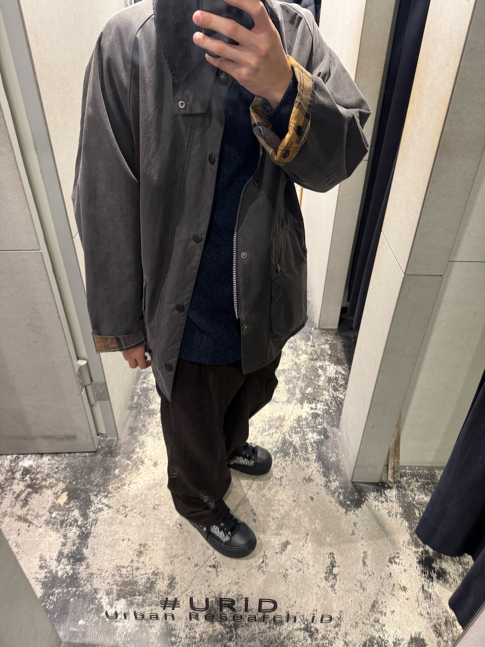 ネイビーのニット、ブラウンのスラックスを合わせて、カジュアルな雰囲気を作り、上からバブアーのグレーのジャケットを羽織っています!
