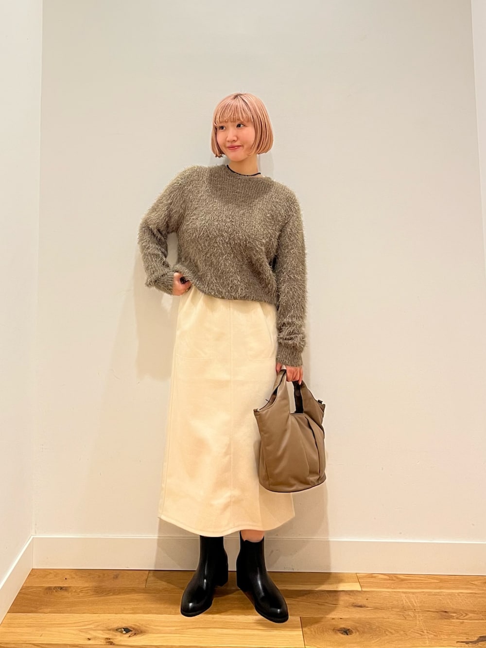 ふわりとしたシャギー特有の表情を楽しみつつも、一般的なシャギーよりやや度詰めで編み立てることで生地が安定し、着用時のラインが崩れにくいよう工夫されています!