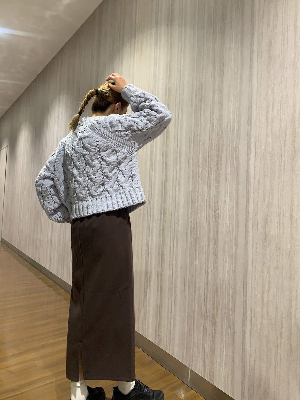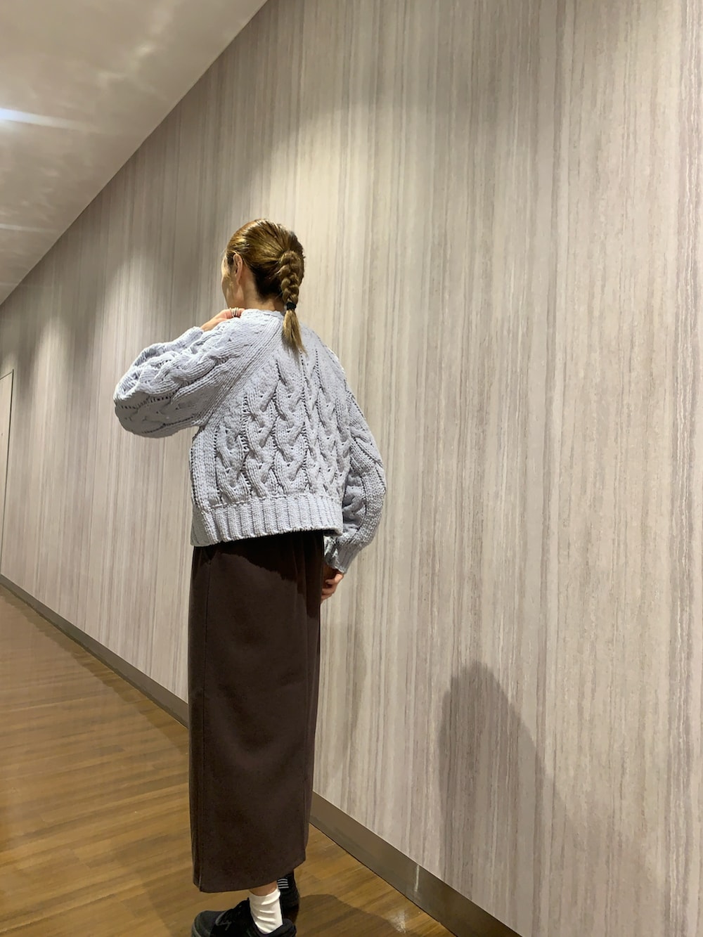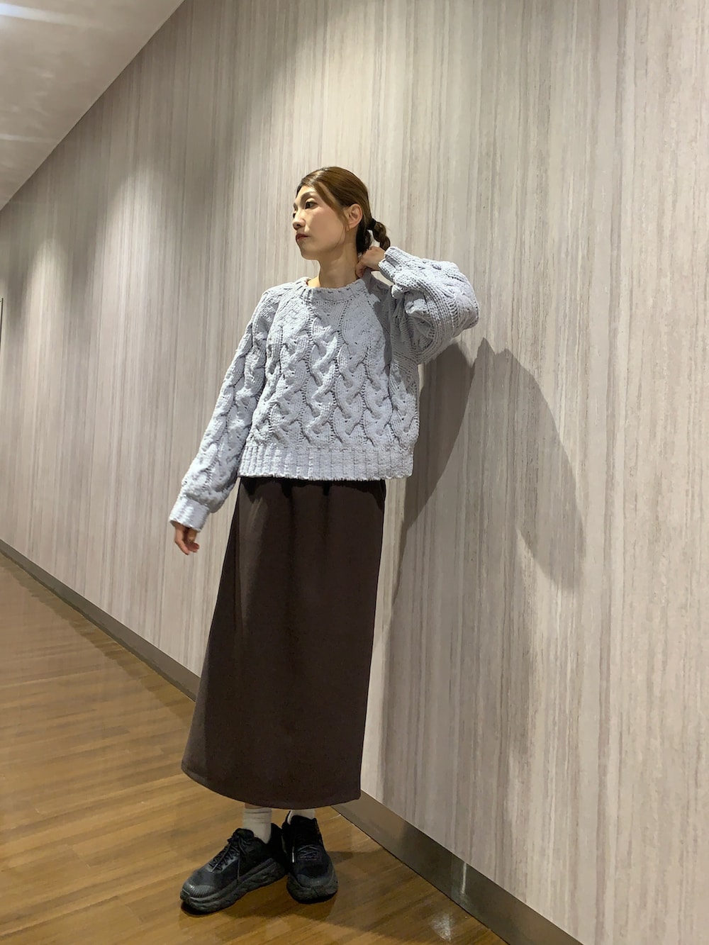 トップスは、大きなケーブル編みがとても目を惹きます。