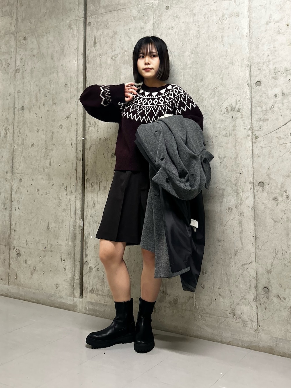 中はボルドーのノルディックニットで、アウター脱いでもかわいくしました⸜❤️⸝